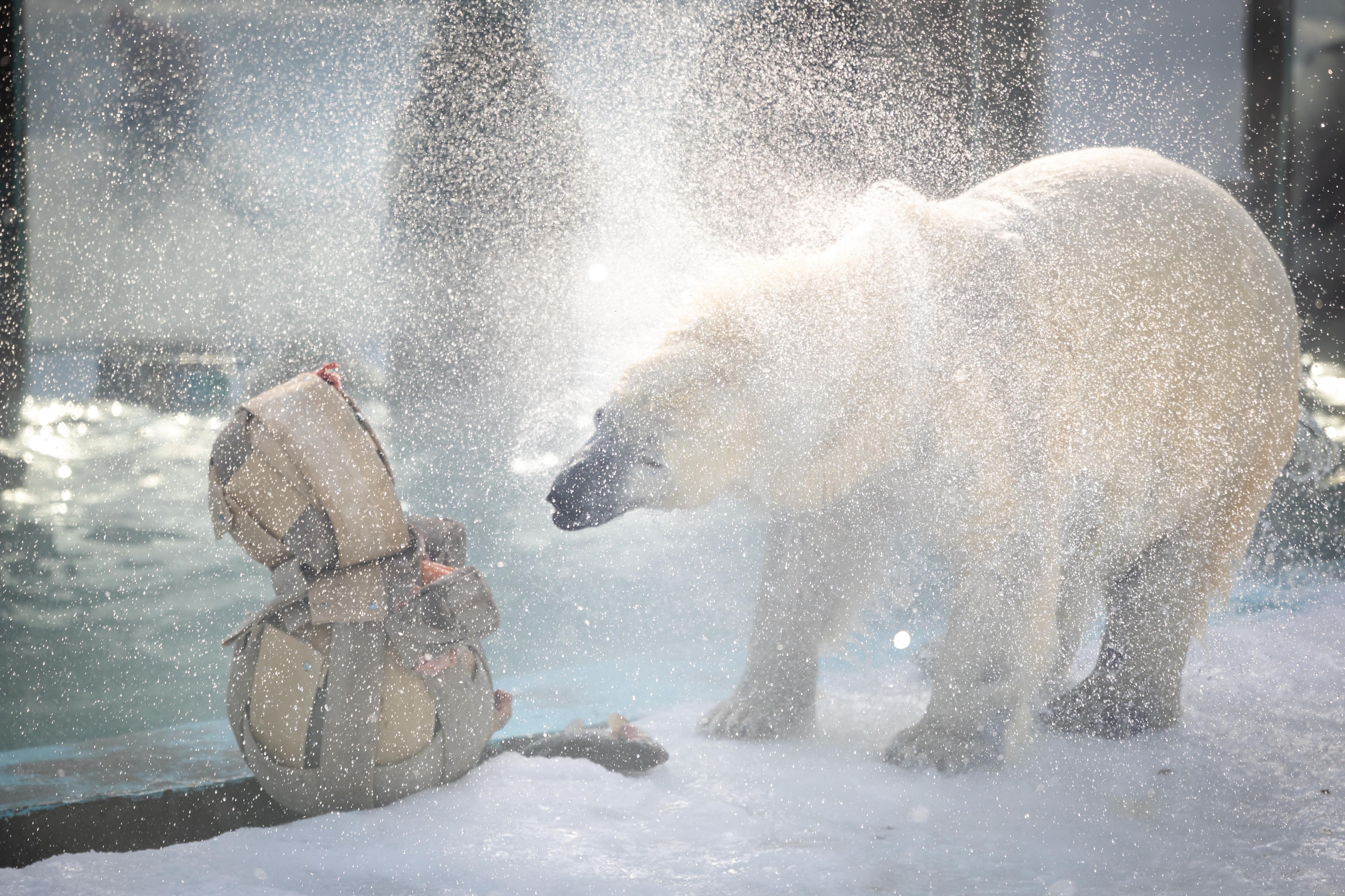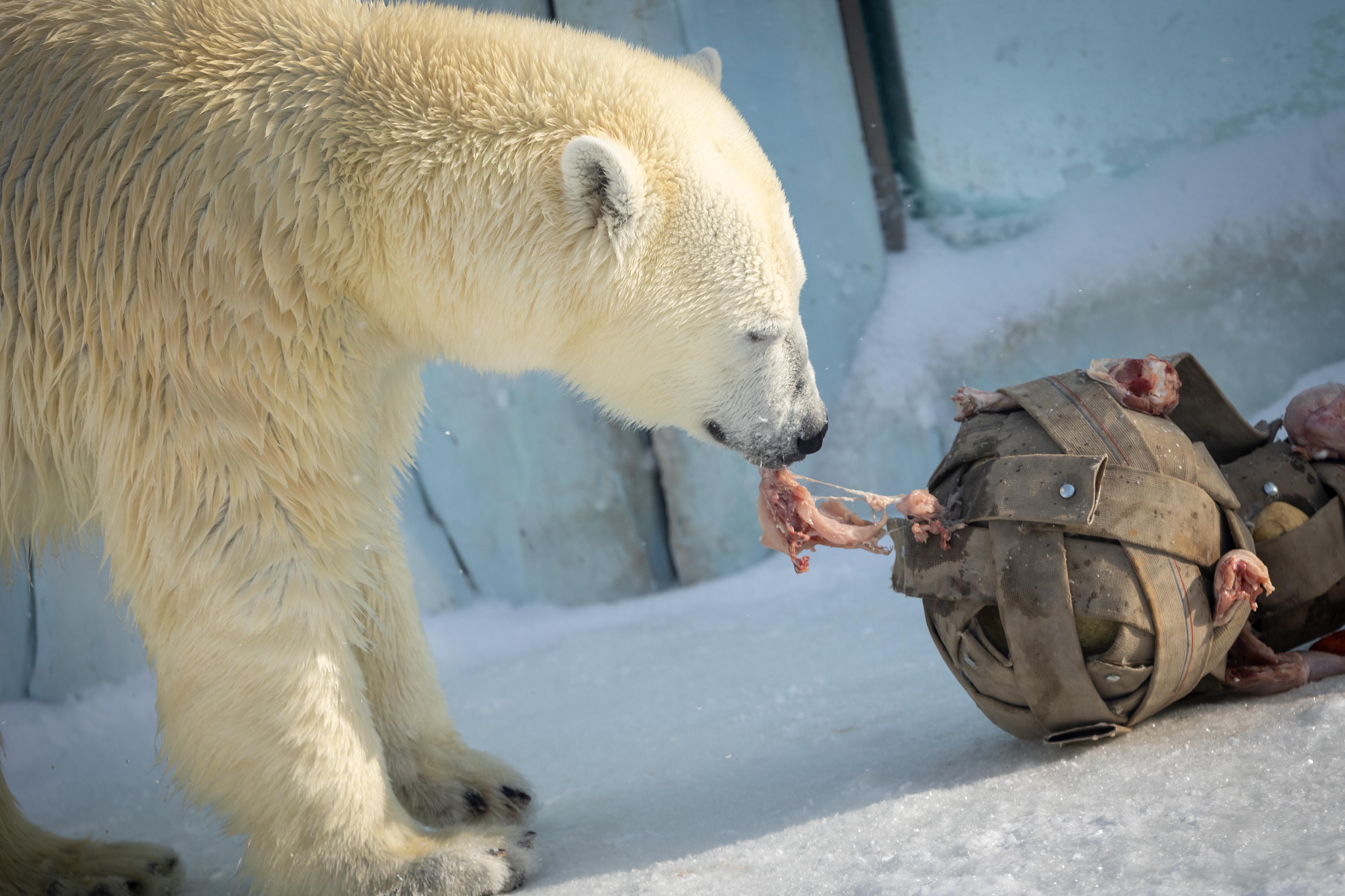 В Екатеринбургском зоопарке для белых медведей устроили праздничный обед с мясом и живой рыбой.