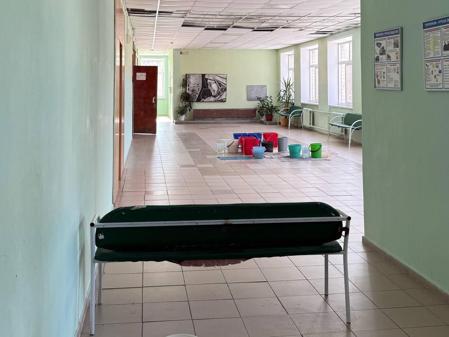 В лингвистической гимназии №144 в Екатеринбурге на третьем этаже протекла кровля. В результате затопления педагоги были вынуждены экстренно собирать воду в любые доступные ёмкости.