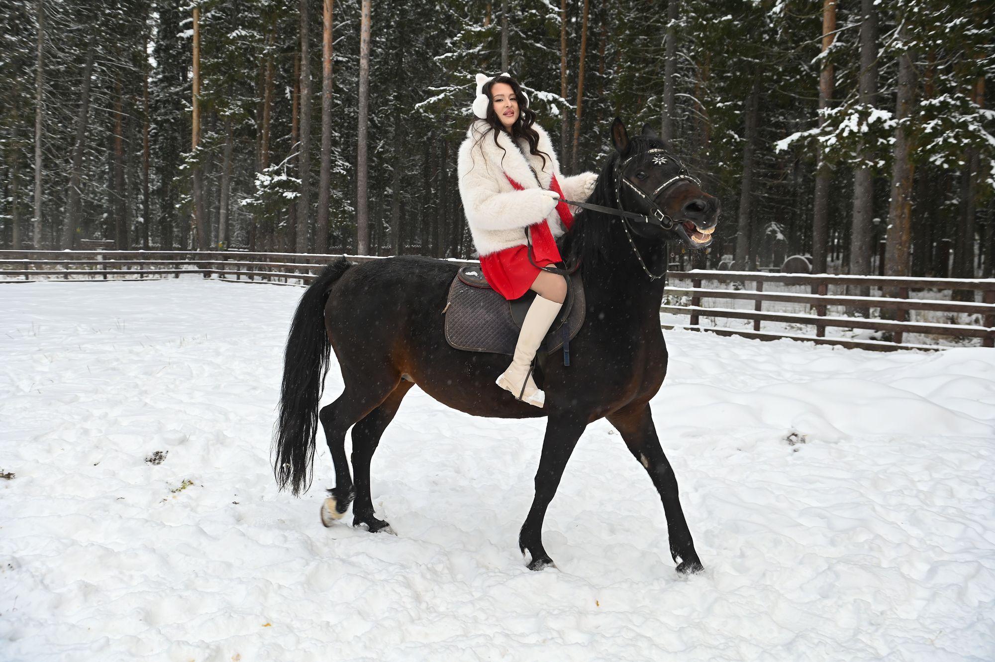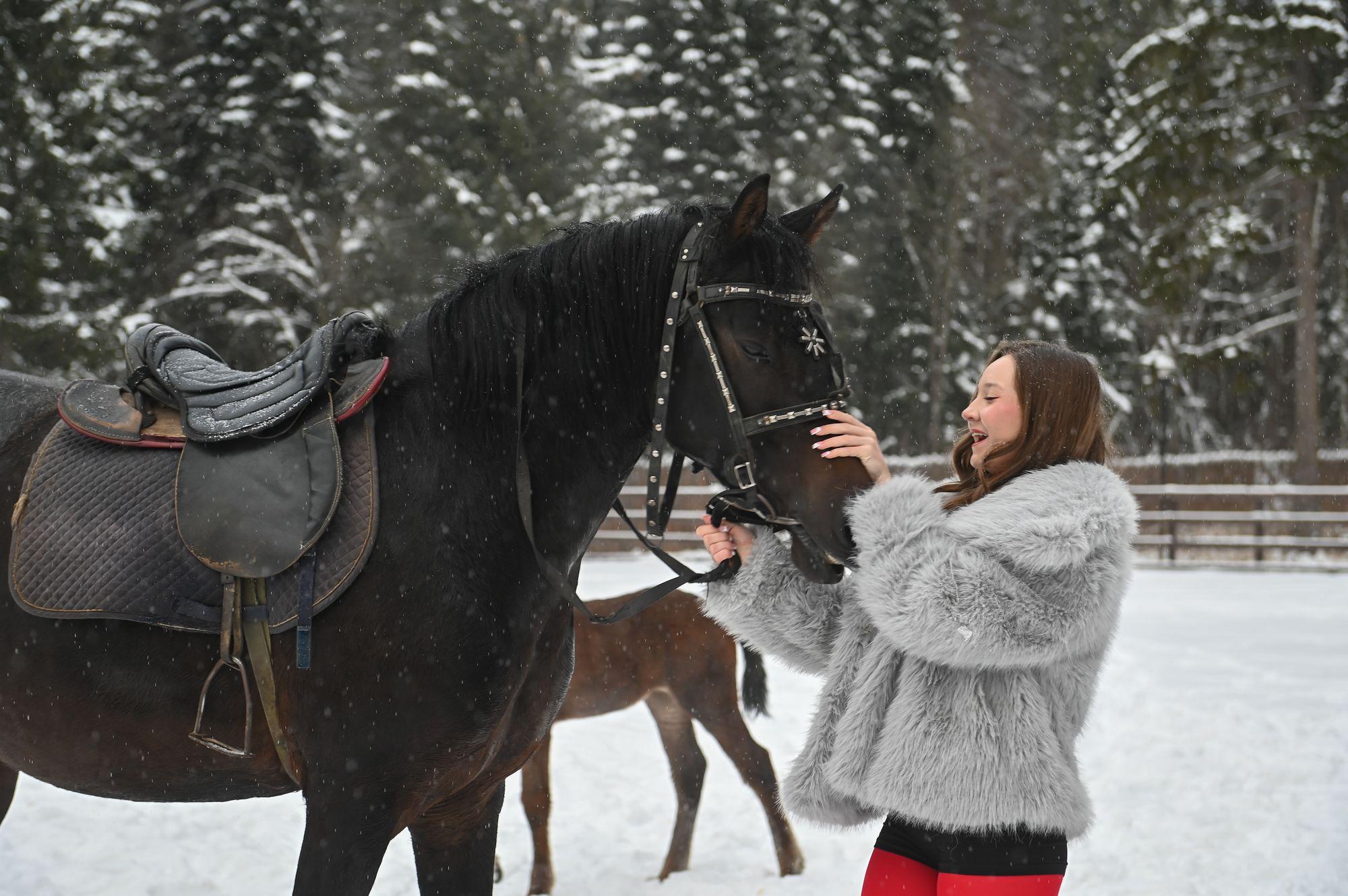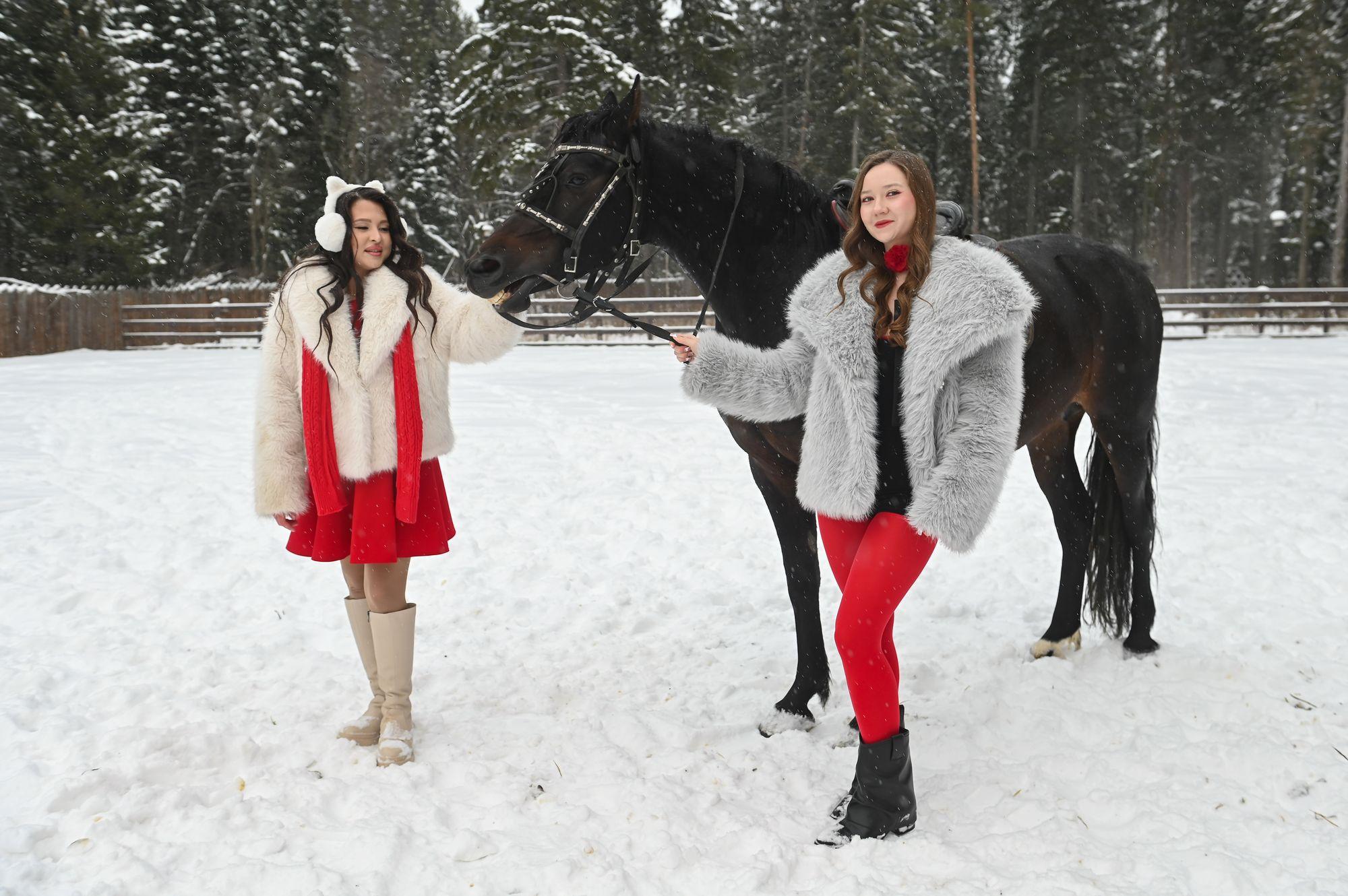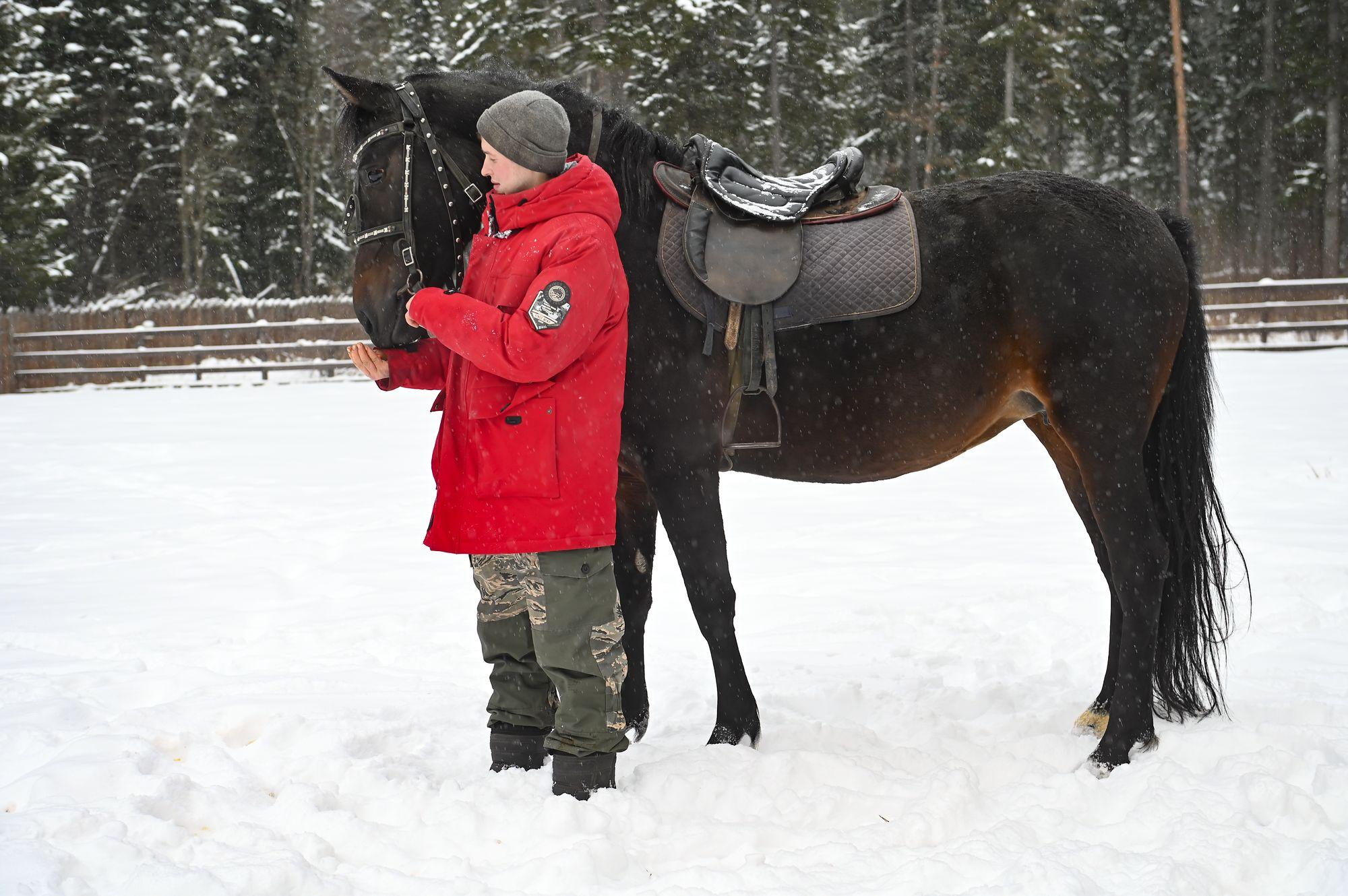 В организации фотосессии моделям помогал конюх по имени Максим. Он также выбрал для этого дня одежду красного цвета.
