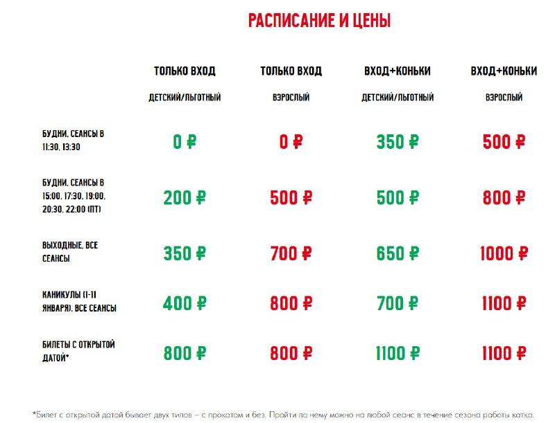 Стоимость одного сеанса варьируется от 200 до 1100 рублей. Цена зависит от дня недели — будни, выходные или праздничные дни — а также от необходимости аренды коньков. В целом билеты подорожали на 100 рублей по сравнению с прошлогодними тарифами.