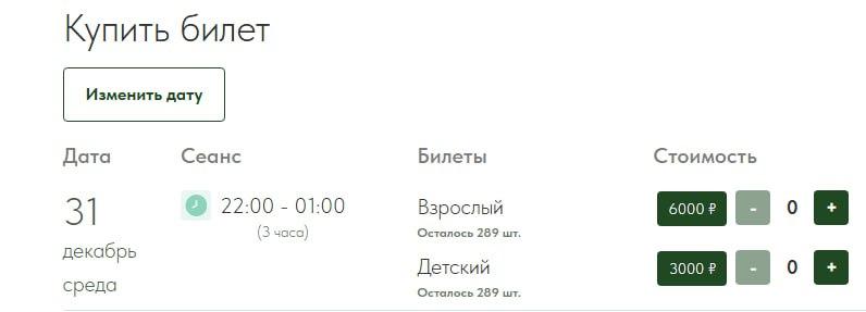 На новогоднюю ночь действует отдельный тариф: детский билет стоит 3000 рублей, взрослый — 6000 рублей.
