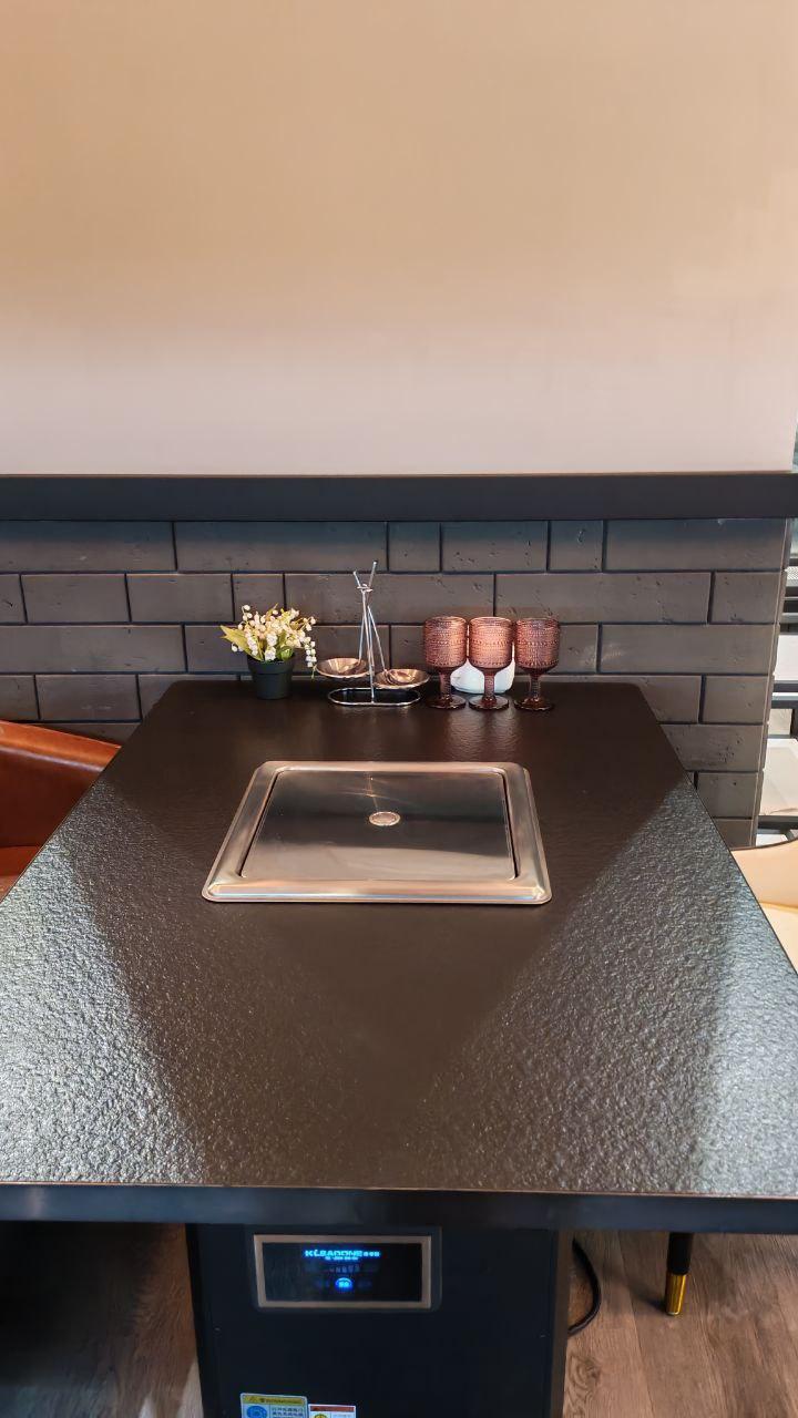 Посетители могут самостоятельно жарить мясо на специальных плитах, встроенных в центры столов.