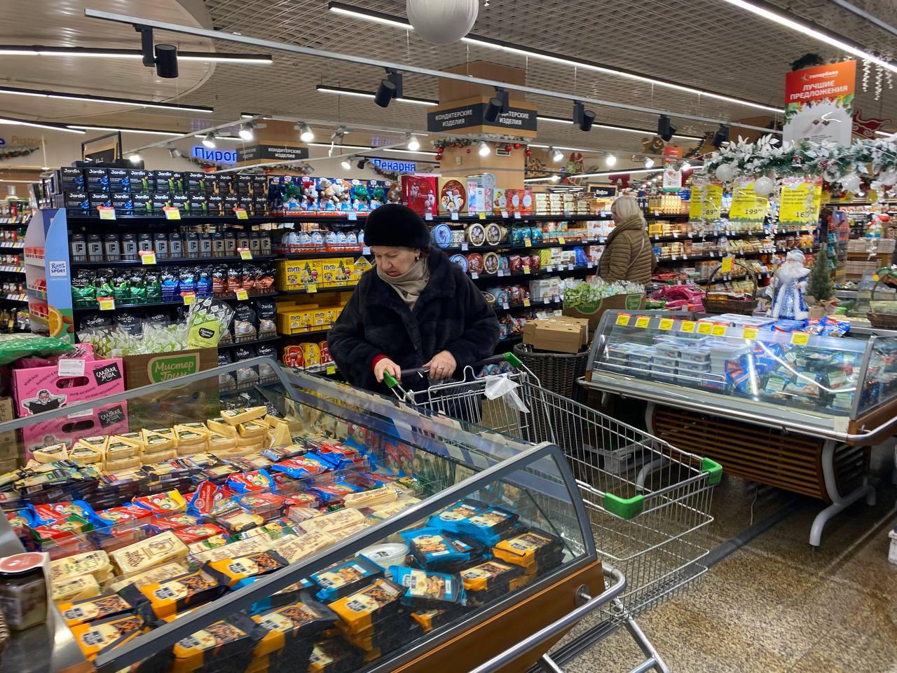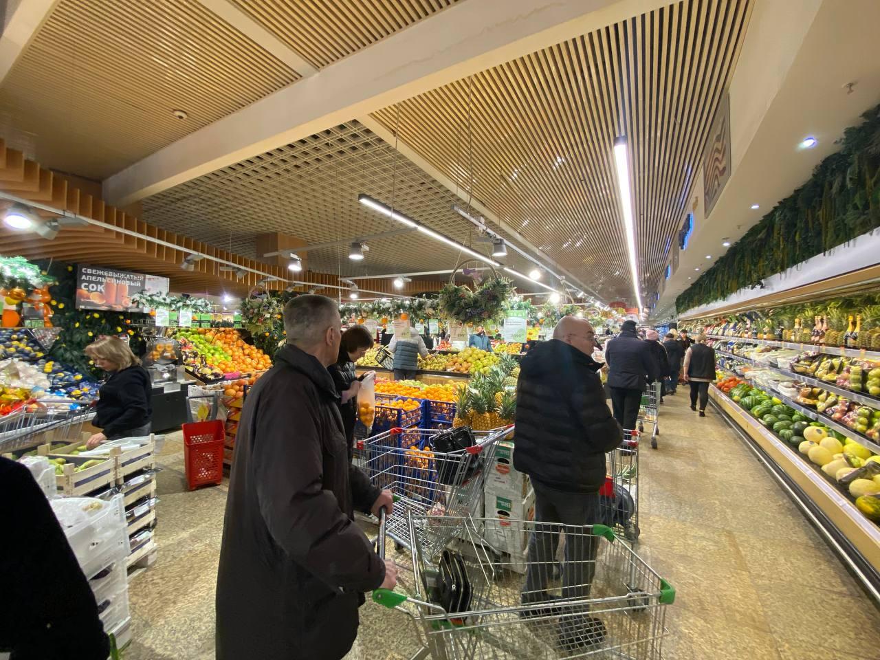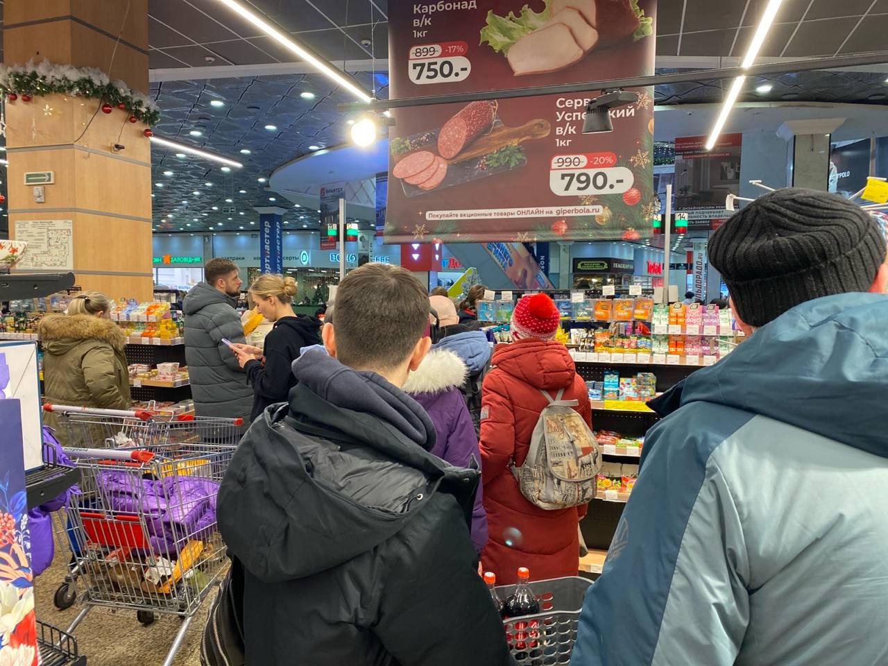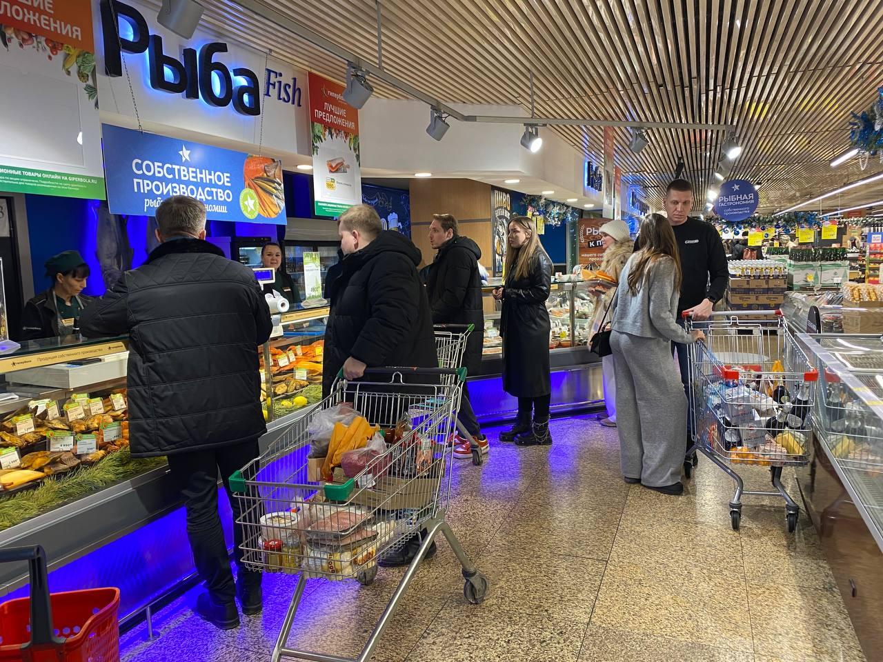 Особенный ажиотаж царит в магазине «Гипербола» в отделе готовой продукции: горожане приобретают салаты, рыбу и выпечку буквально ведрами. У касс выстраиваются очереди из покупателей с переполненными тележками.