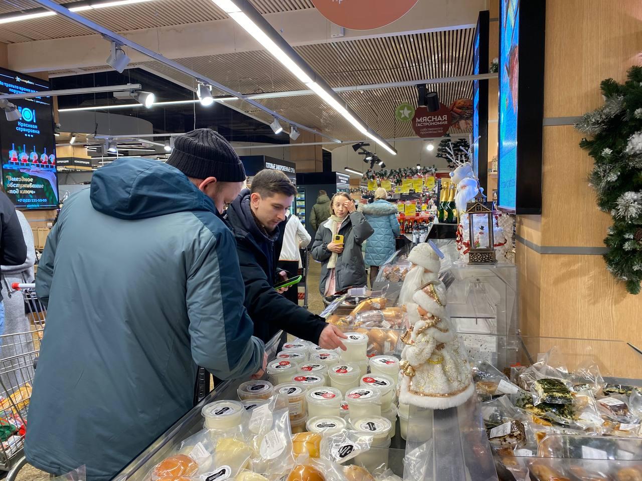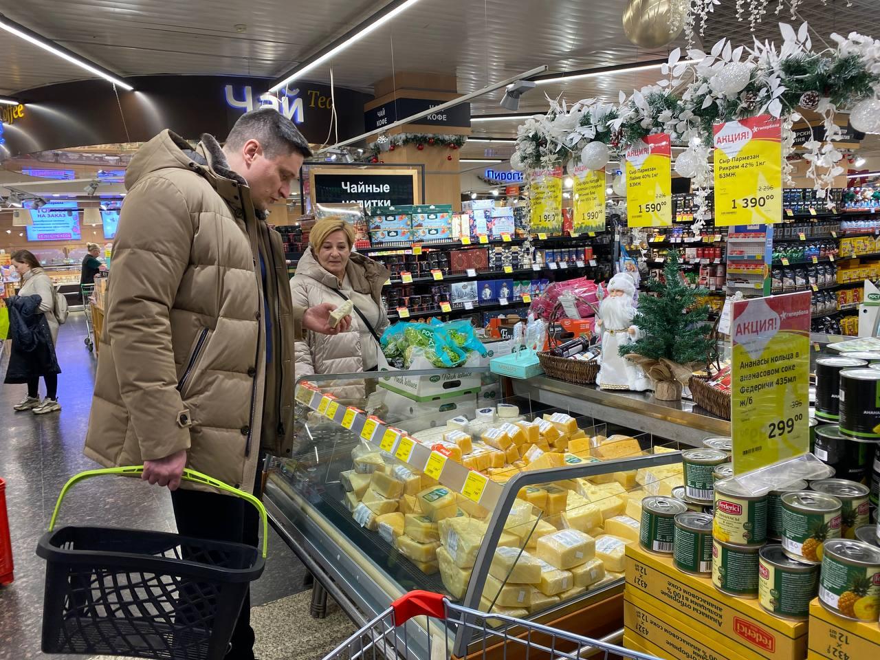 Покупатели выбирают сыры и колбасы для новогоднего стола.