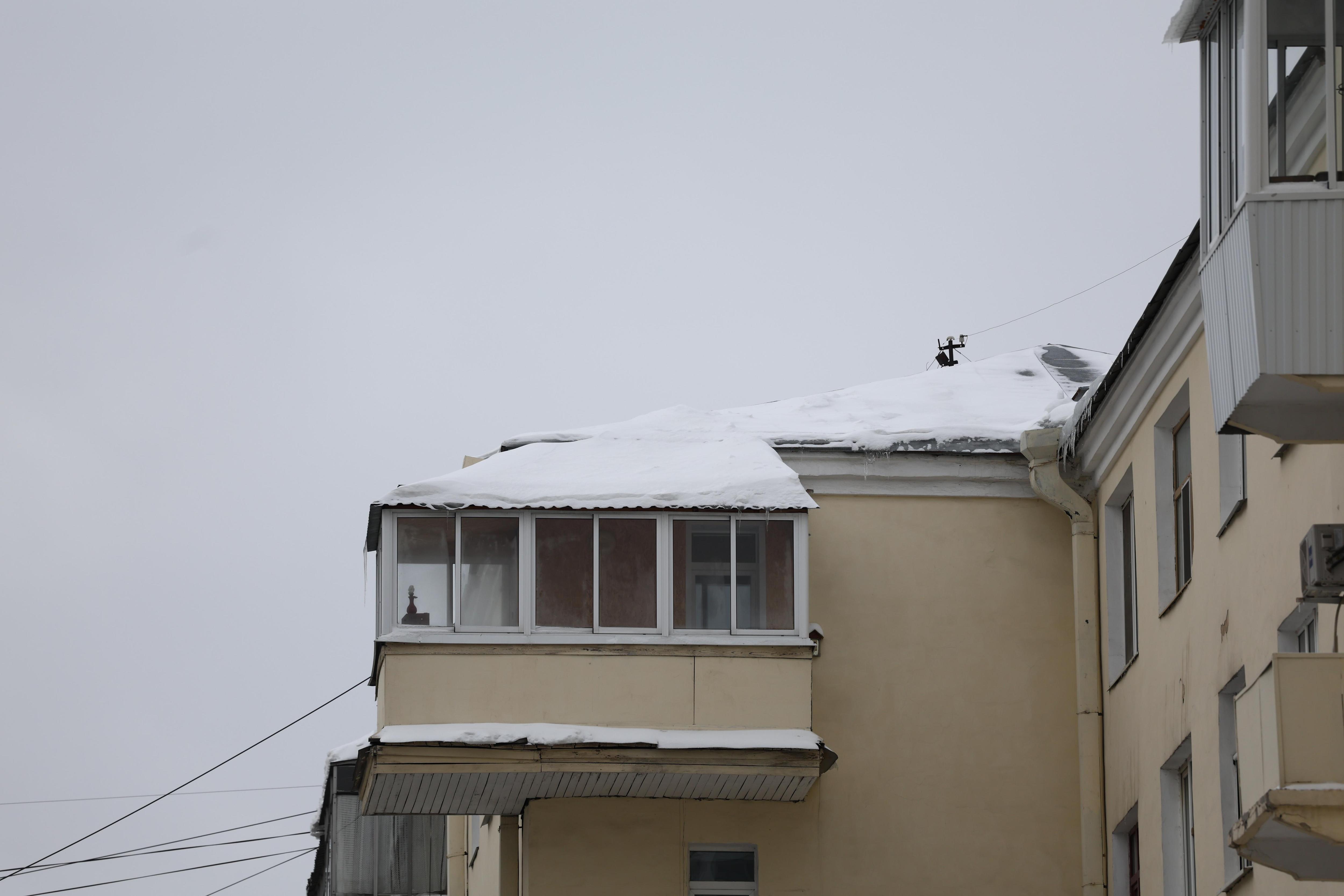 Снежные массы на крышах представляют опасность и могут упасть на головы прохожих.