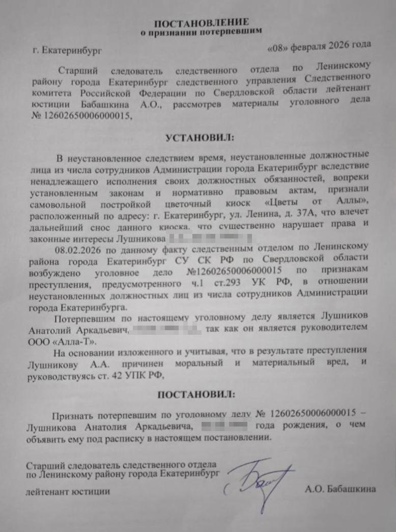 Потерпевшим по делу признан действующий владелец торговой точки Анатолий Лушников, которому уже вручили соответствующее постановление.