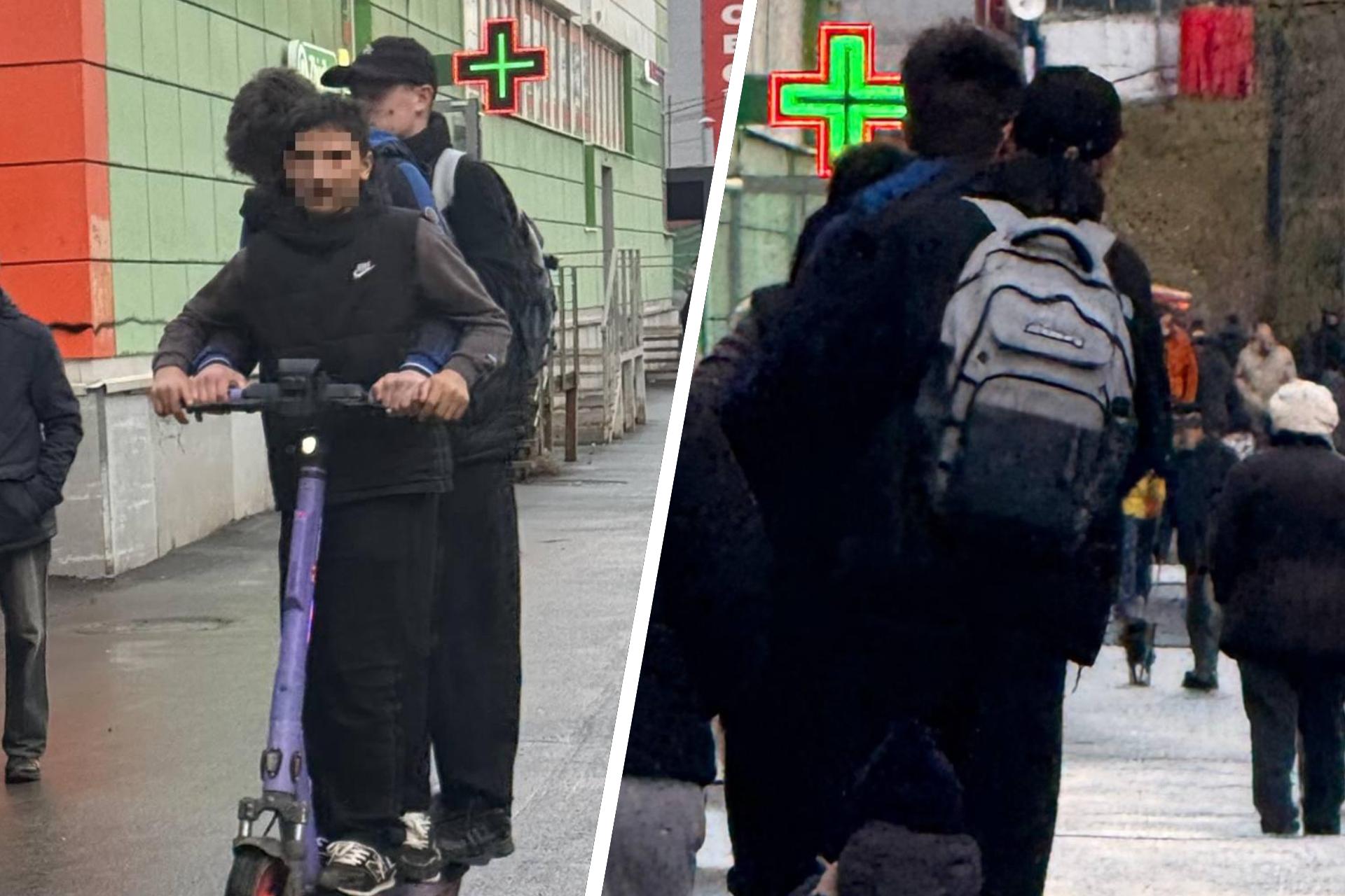 Вечером 23 апреля в Екатеринбурге подростки катались втроем на одном самокате, грубо отвечая прохожим, а затем были найдены и оштрафованы.