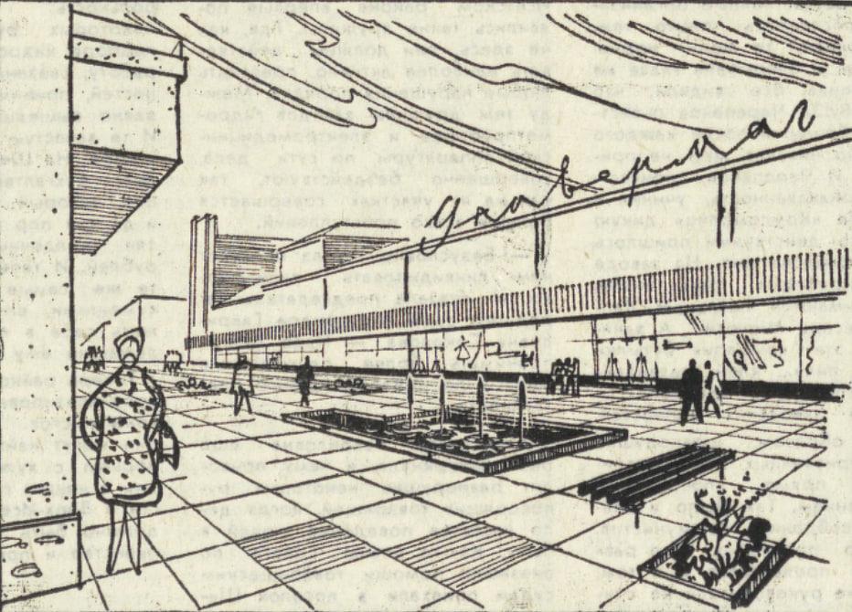 В публикации подробно описывался проект: «Улица Вайнера (от улицы Попова до Малышева) будет полностью закрыта для транспорта. Покупатели смогут свободно пересекать площадь между двумя торговыми рядами. Ее выложат бетонными плитами, а небольшой бассейн с фонтаном и зеленые растения образуют приятный уголок отдыха. Со стороны улицы Малышева выносная демонстрационная витрина наглядно известит о том, какие предприятия включает в себя торговый комплекс. Яркие, броские аншлаги соединят в этой части обе стороны улицы Вайнера, придав законченность ее рекламному оформлению».
