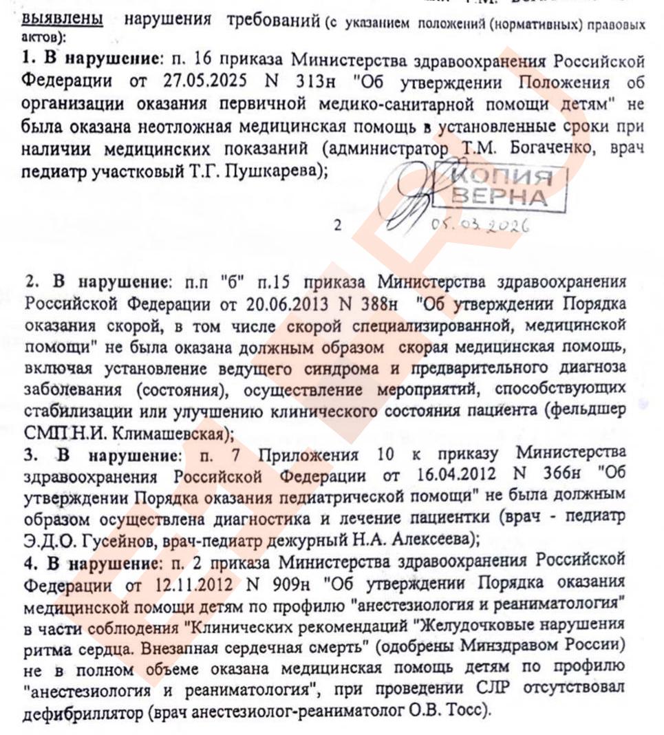 Экипаж скорой помощи также допустил серьёзные промахи. В документах был указан нормальный уровень сатурации (99%), хотя медики позже признались, что этот показатель вообще не измеряли. Врач также внесла в карту ложные сведения о проведении кислородной ингаляции.