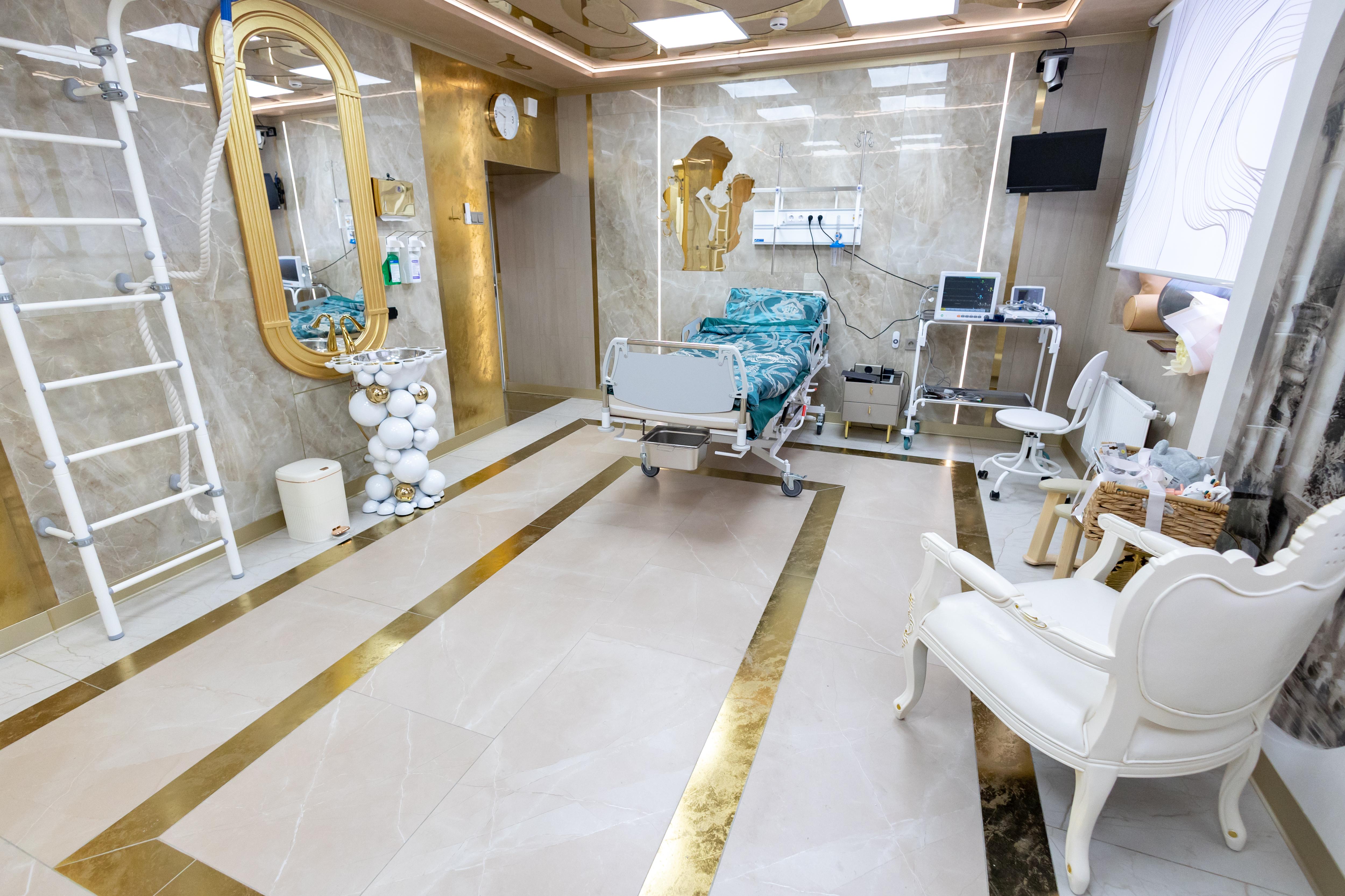 - Помещения оснащены функциональными кроватями, которые могут менять положение, что позволяет, в частности, проводить вертикальные роды.