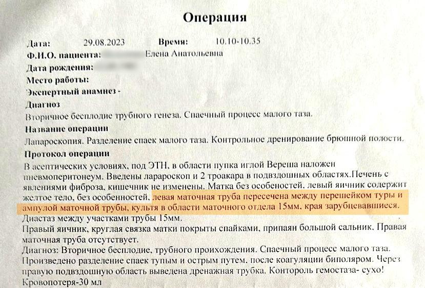Спустя полтора года выяснилось, что во время операции медики повредили также левую маточную трубу, оставшуюся здоровой. Елена окончательно утратила возможность забеременеть естественным путем.