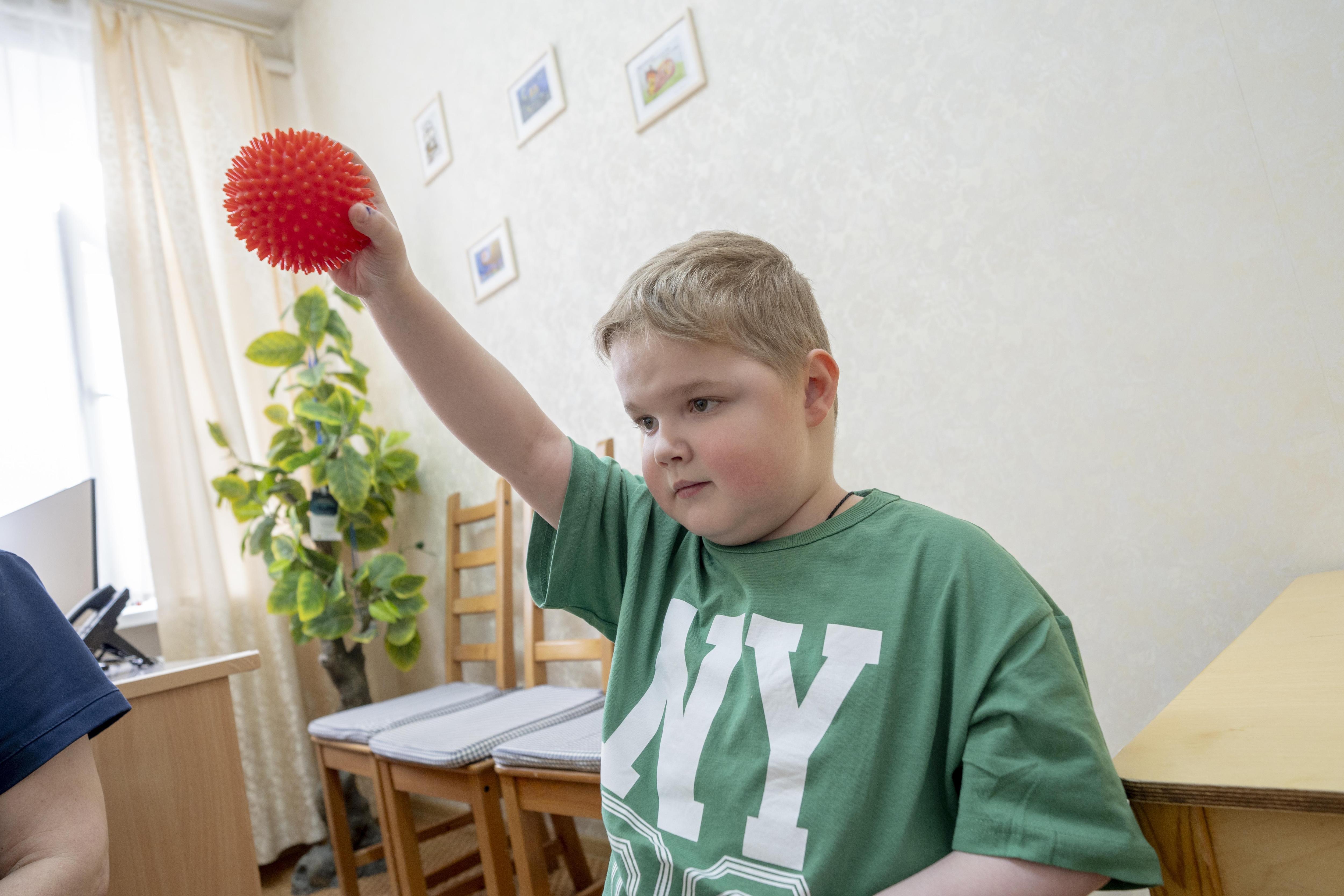 Мальчик старательно выполняет все упражнения во время реабилитации