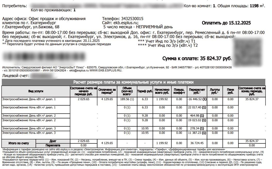 «Показания по старому счетчику не передавались с сентября 2024 года вплоть до установки нового, расчет производился по нормативу, — отметили в „Энергосбыте“. — В результате перерасчета были выполнены следующие корректировки: снятие объемов на сумму -16 446,52 рубля за день (Т1) и доначисление на сумму +22 017,40 рубля за ночь (Т2)».