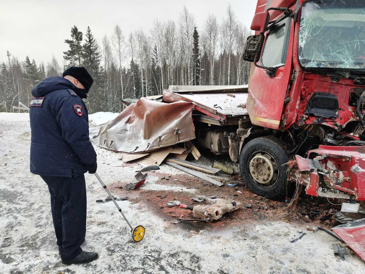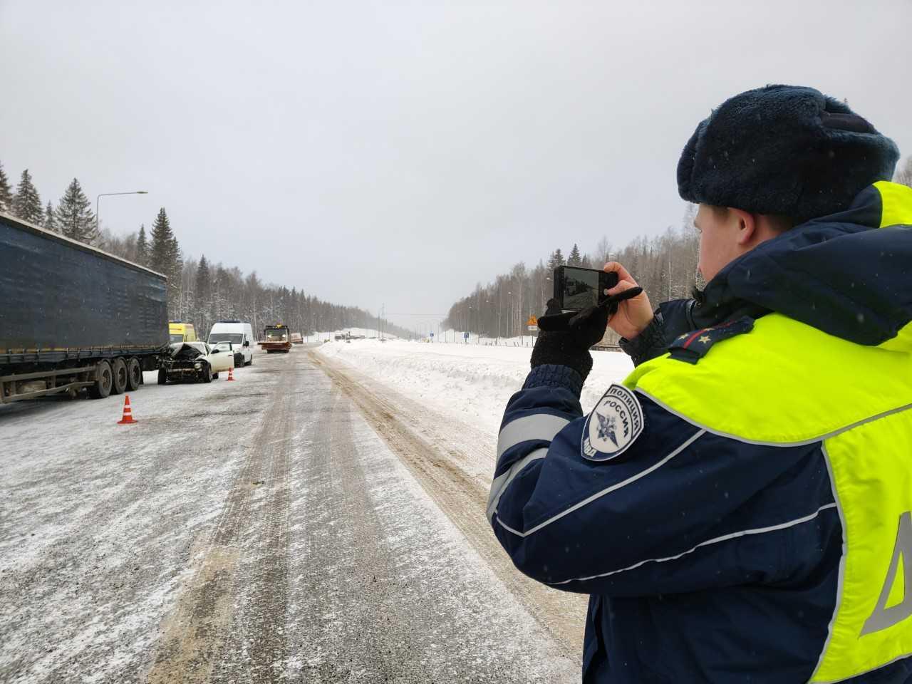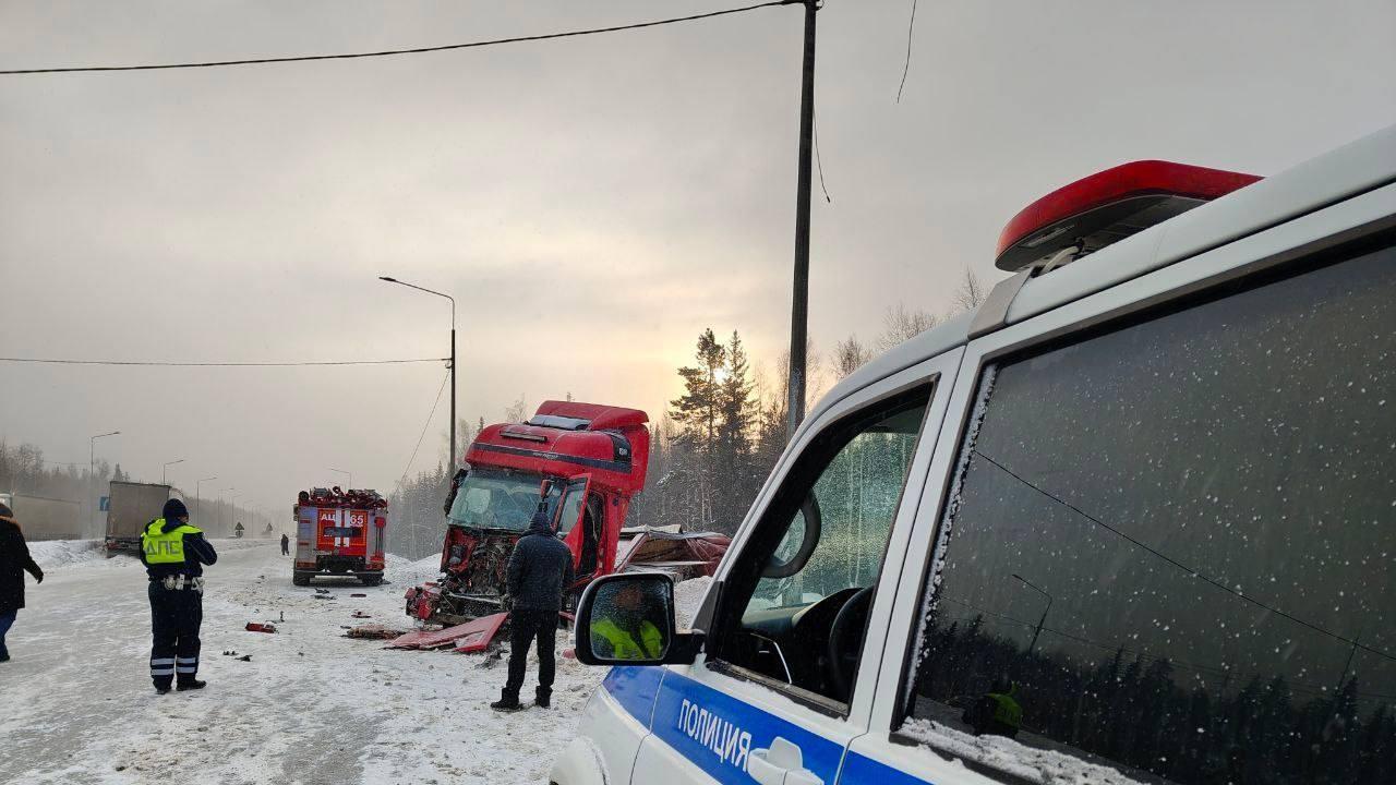 «Вслед за этим автомобиль FAV с полуприцепом совершил наезд на стоящий грузовик Volvo с полуприцепом, после чего въехал в снежный вал у металлического дорожного ограждения, разделяющего встречные потоки», — рассказали в Госавтоинспекции региона.