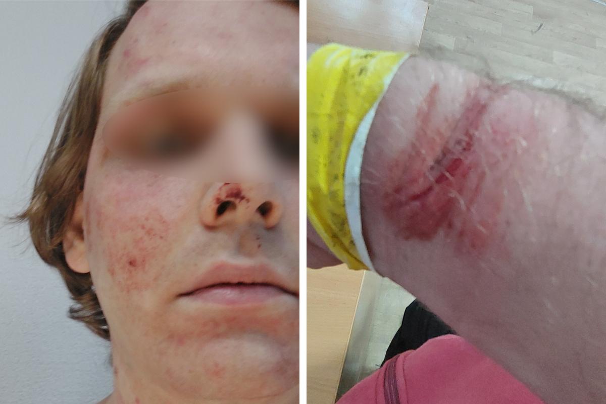 На лице посетителя видны синяки, а на запястьях остались следы от наручников.