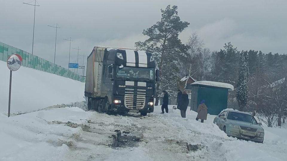 На окраине Екатеринбурга грузовик забуксовал на заснеженной дороге, перекрыв единственный выезд для жителей нескольких садоводств.