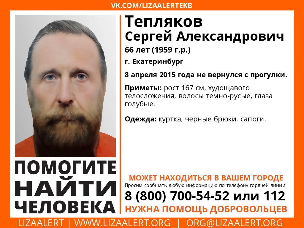 - Сергей Тепляков, житель Екатеринбурга, пропал 8 апреля 2015 года. Мужчина вышел погулять со своей собакой, которую позже обнаружили привязанной к дереву в парке. Сам Сергей бесследно исчез. На момент пропажи ему было 56 лет, сейчас ему должно было бы исполниться 66 лет.