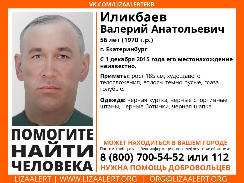 - Валерий Иликбаев, сотрудник одной из екатеринбургских организаций, 1 декабря 2015 года неожиданно ушёл с работы раньше положенного времени и не вышел на связь. Его телефон перестал работать. Вечернюю встречу с родными он так и не посетил. Сейчас ему должно было бы быть 56 лет.