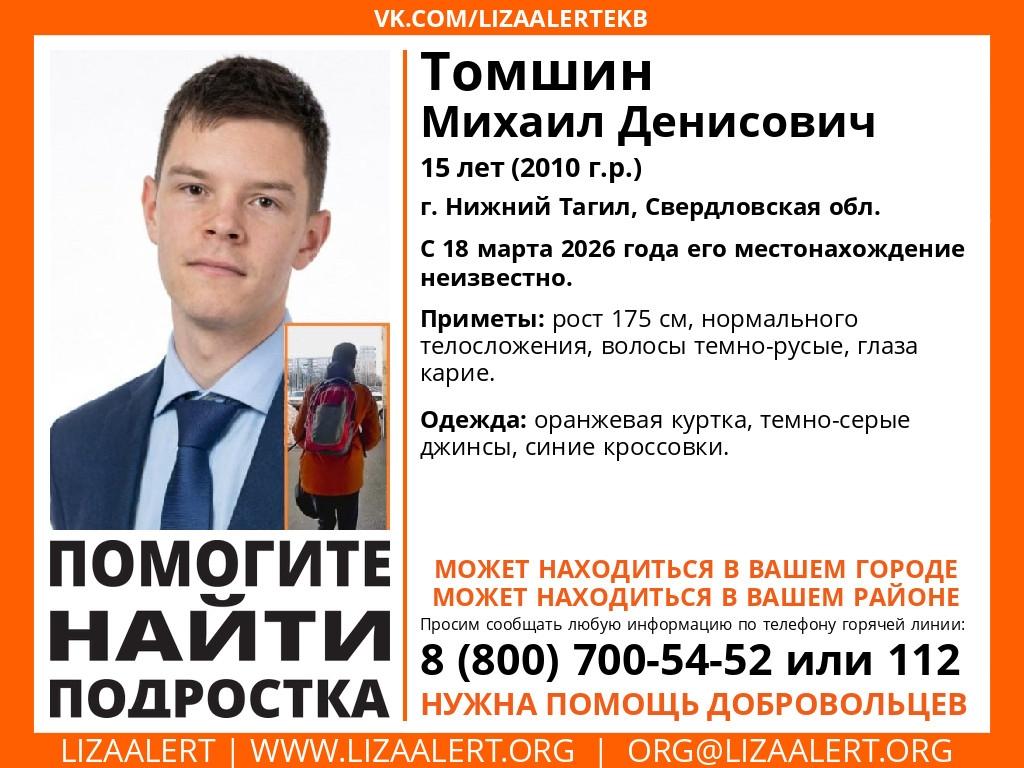 Поисковый отряд «ЛизаАлерт» проводит поиски 15-летнего Михаила Томшина, который пропал в Нижнем Тагиле 18 марта 2026 года.