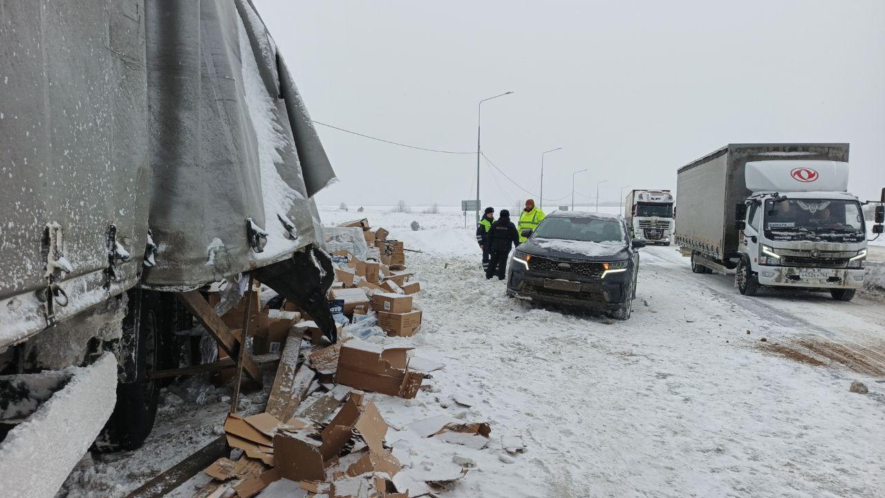 В результате столкновений прицеп одного из грузовиков DAF частично разрушился, и груз рассыпался по проезжей части.