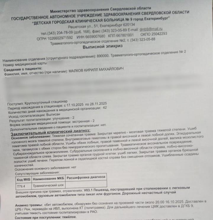 Кирилла доставили в реанимацию Режевской больницы, а ночью перевели в детскую городскую больницу №9 в Екатеринбурге. У него диагностировали закрытую черепно-мозговую травму, ушибы печени и легких, а также перелом таза.