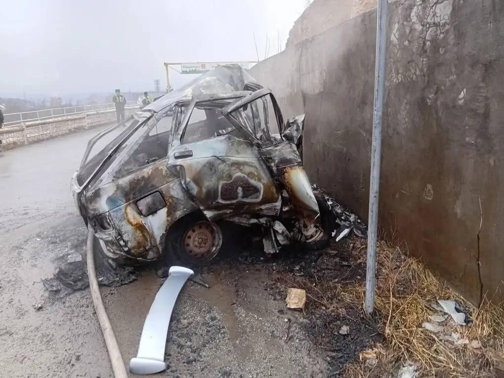 На крутом повороте у дома по улице Кирова, 2 машина врезалась в бетонное ограждение плотины. От удара транспортное средство загорелось. Парень получил тяжелейшие травмы и не смог выбраться, сгорев заживо.