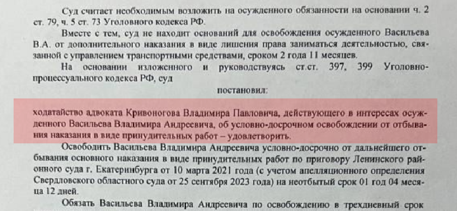 «Освободить Васильева условно-досрочно от дальнейшего отбывания основного наказания в виде принудительных работ по приговору Ленинского суда Екатеринбурга от 10 марта 2021 года на неотбытый срок 1 год 4 месяца», — говорится в постановлении.