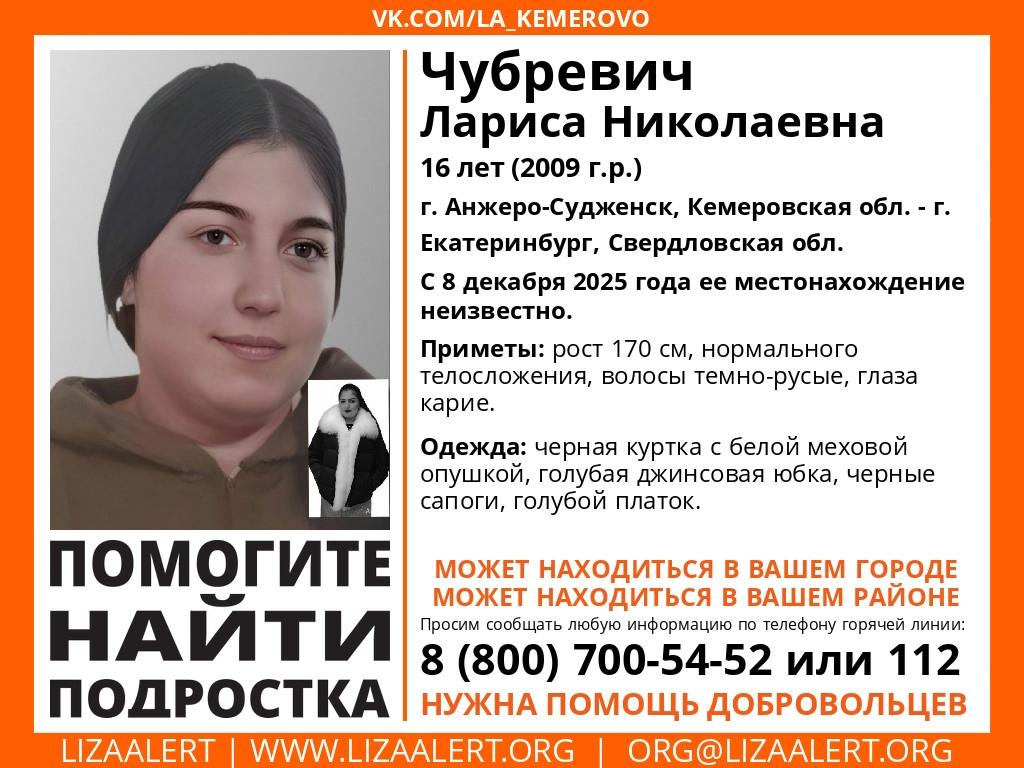 Поиски 16-летней Ларисы Чубревич, приехавшей в Екатеринбург из Кемеровской области, продолжаются с 8 декабря.