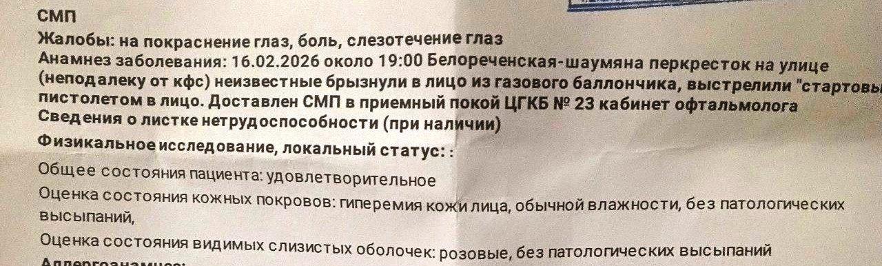 После нападения знакомый пострадавшего вызвал скорую помощь. Медики доставили Евгения в 23-ю больницу, где диагностировали химический ожог лица и конъюнктивы первой степени, а также ссадины мягких тканей лица и шеи. Сейчас мужчина испытывает боль в веках и жжение на коже.