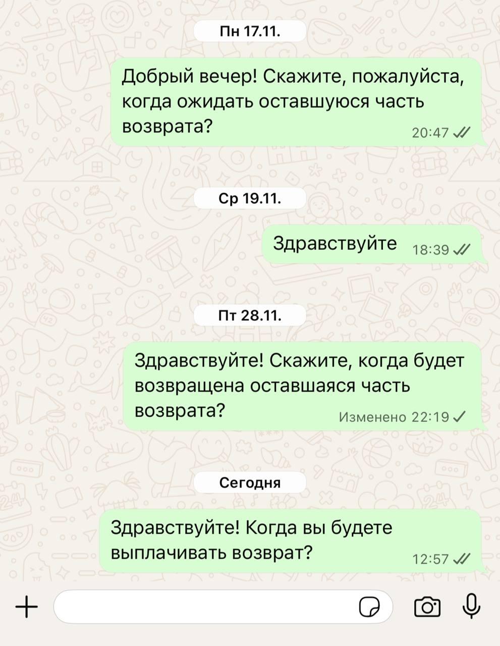 Через месяц после прекращения работы салона клиентке вернули частичную сумму в размере двух тысяч рублей, однако вскоре общение снова прекратилось.