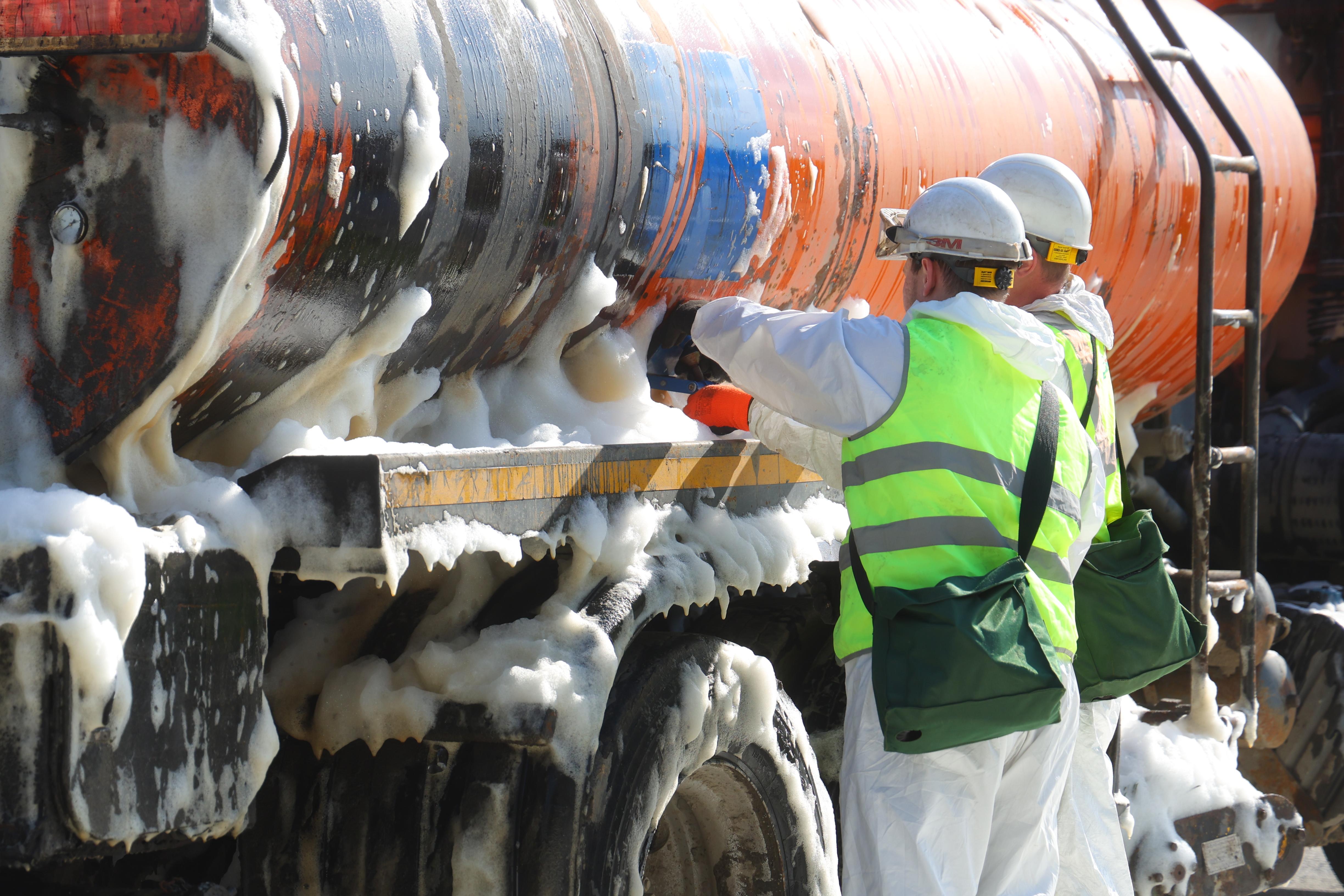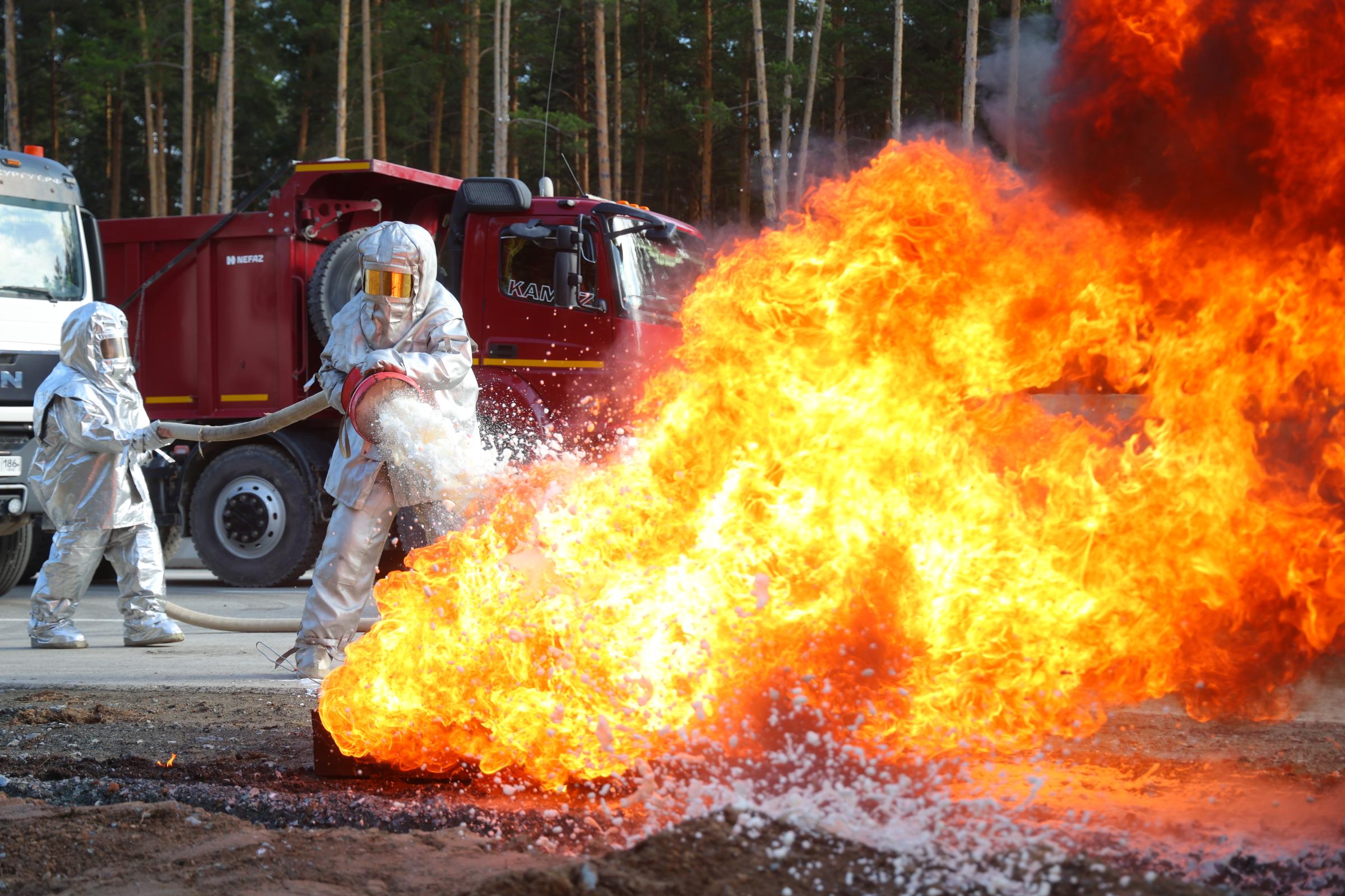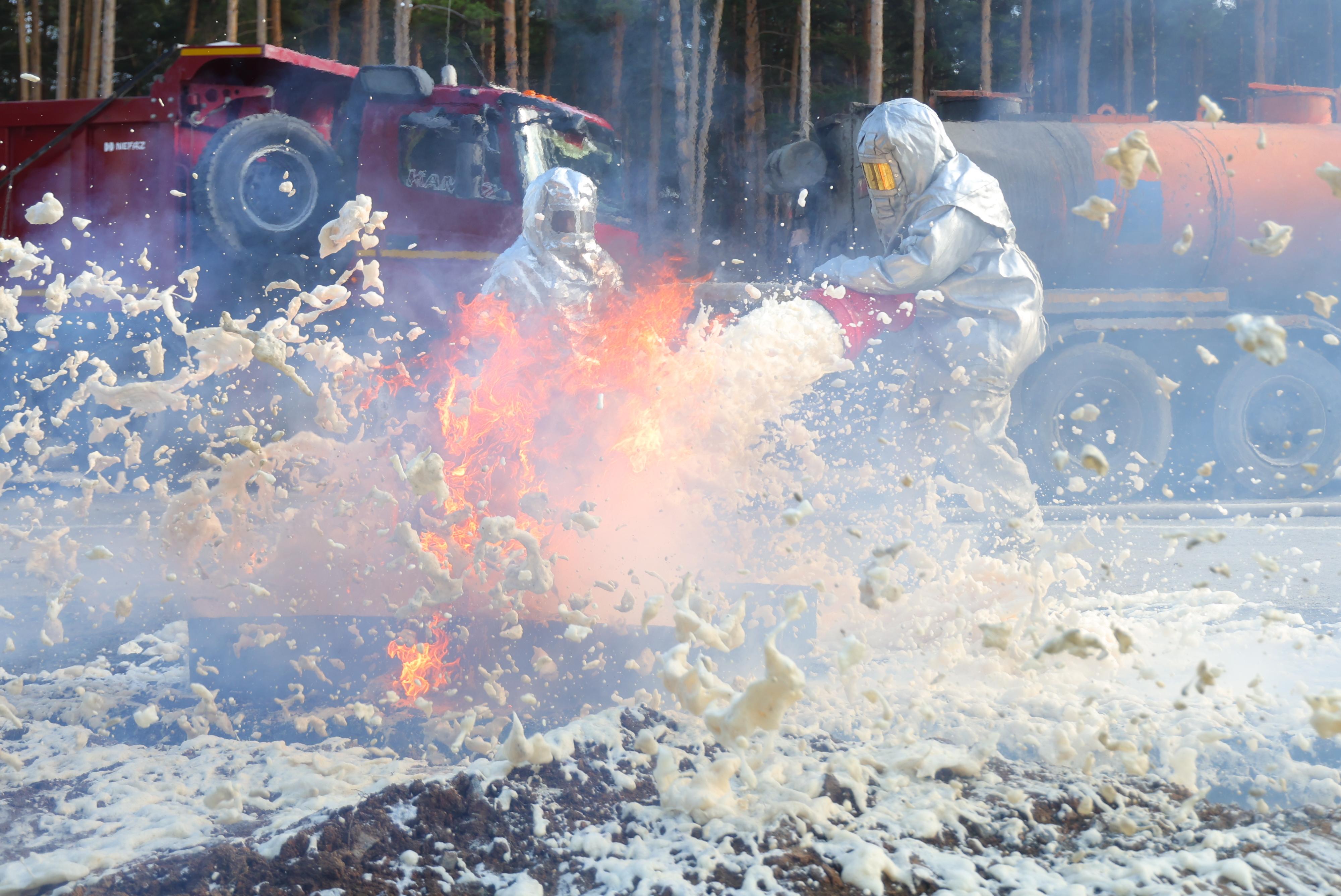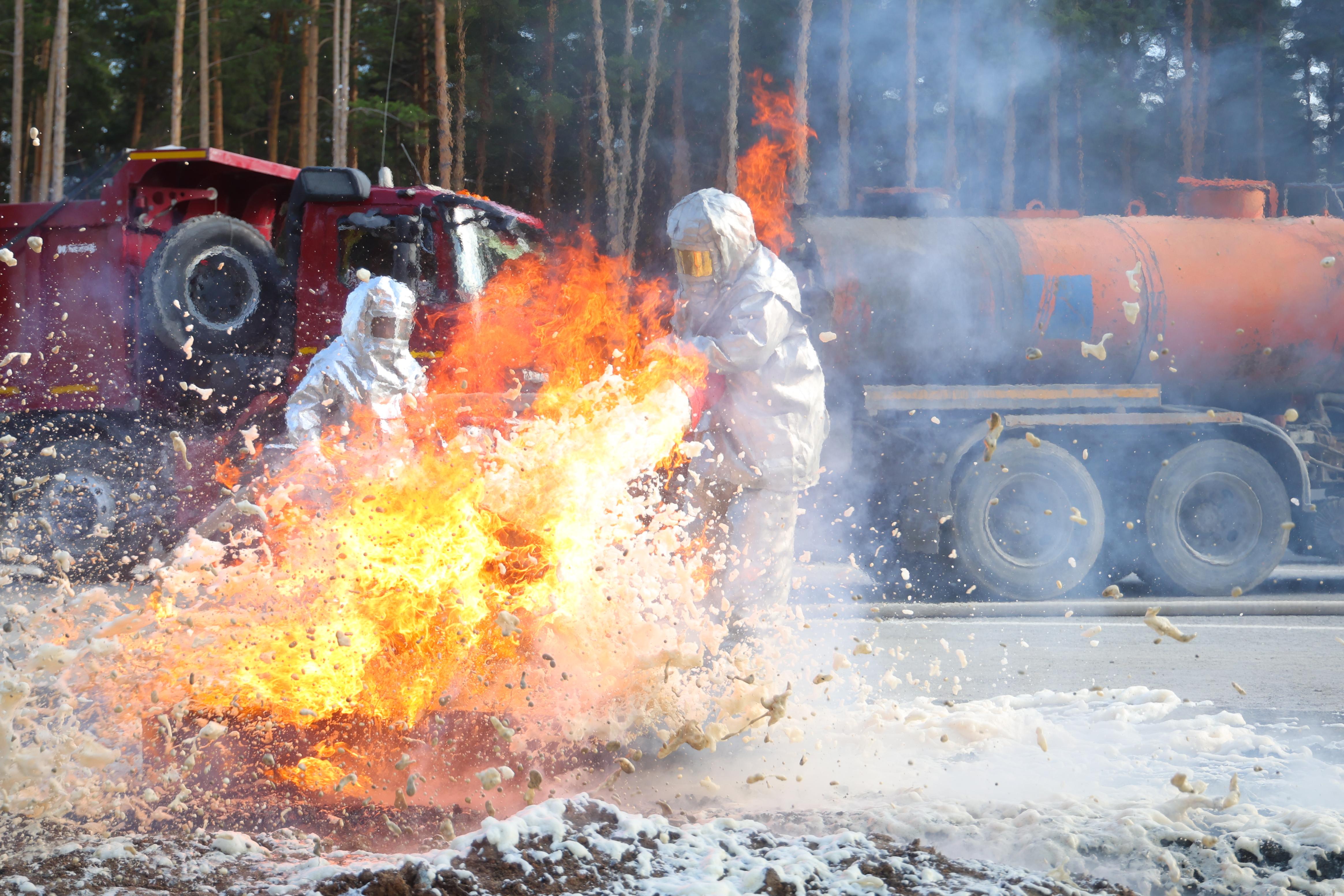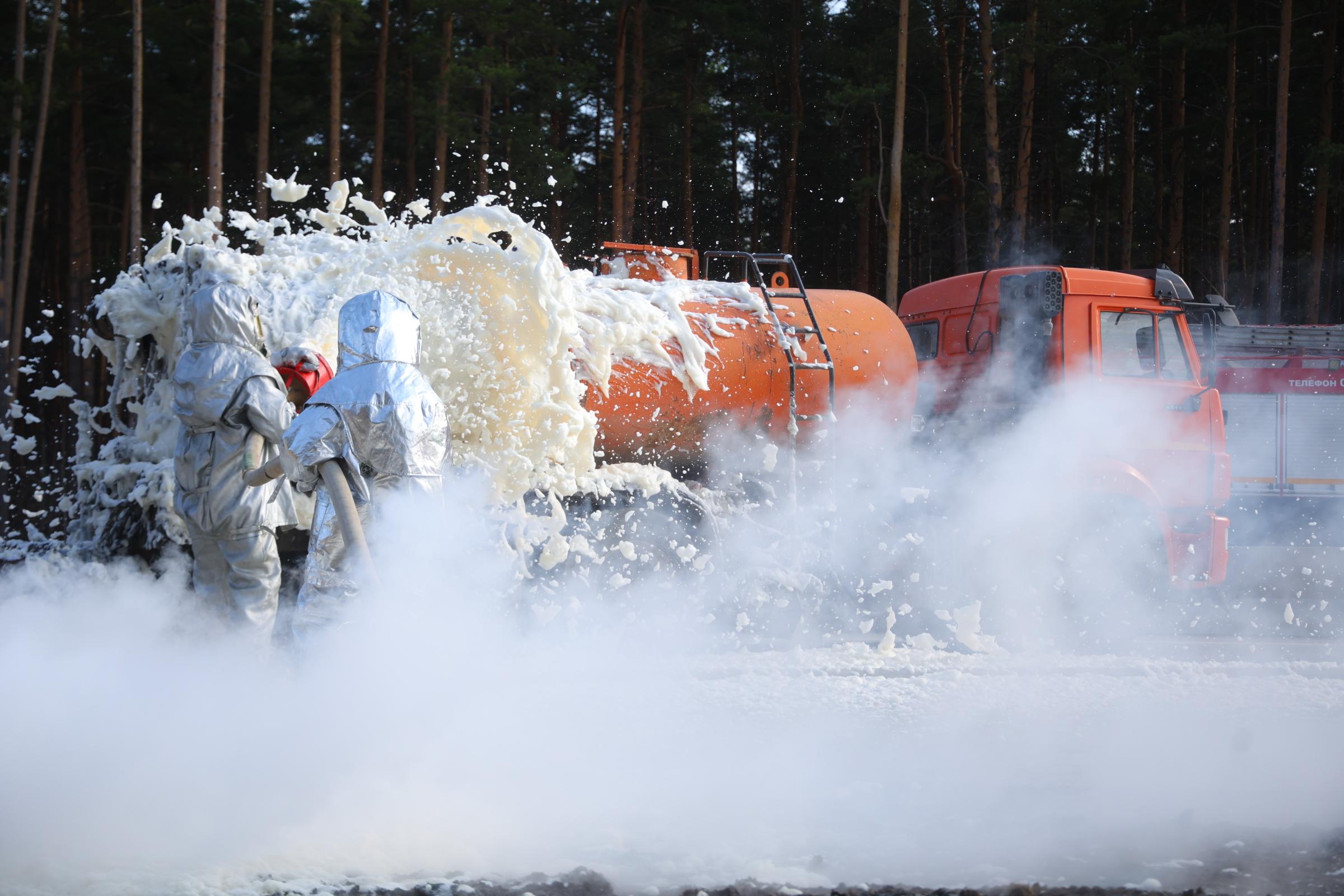 В ходе тренировок спасатели тушили пожар и применяли пену для спасения пострадавших.