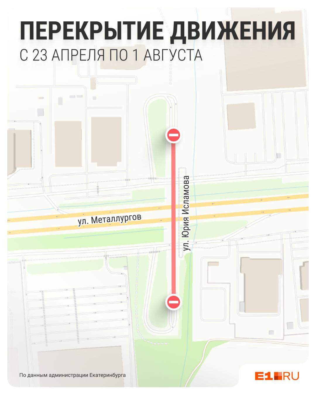 В Екатеринбурге с 23 апреля по 1 августа 2026 года движение по путепроводу на улице Юрия Исламова будет полностью перекрыто. Закрытие связано с проведением строительных работ.