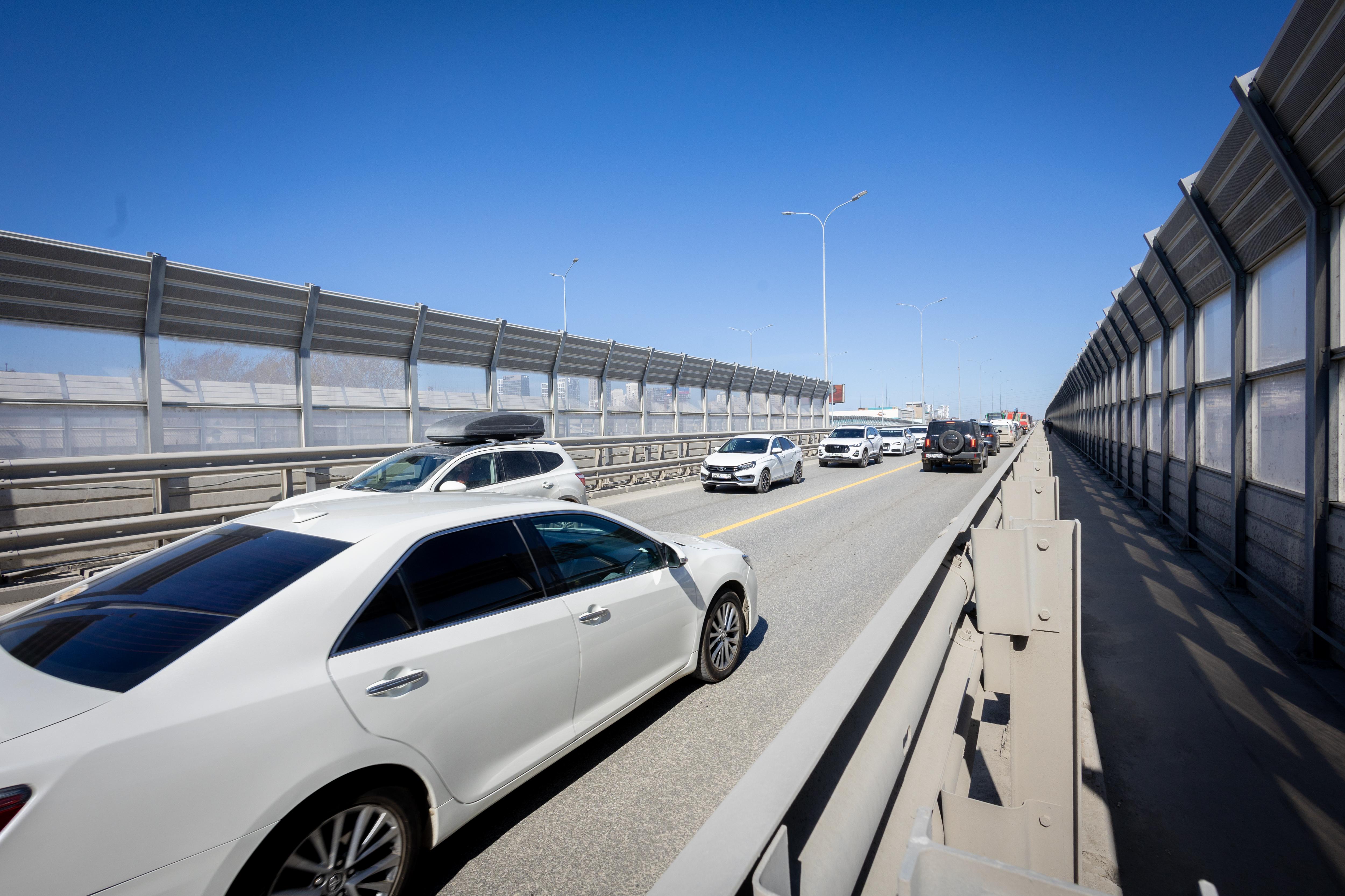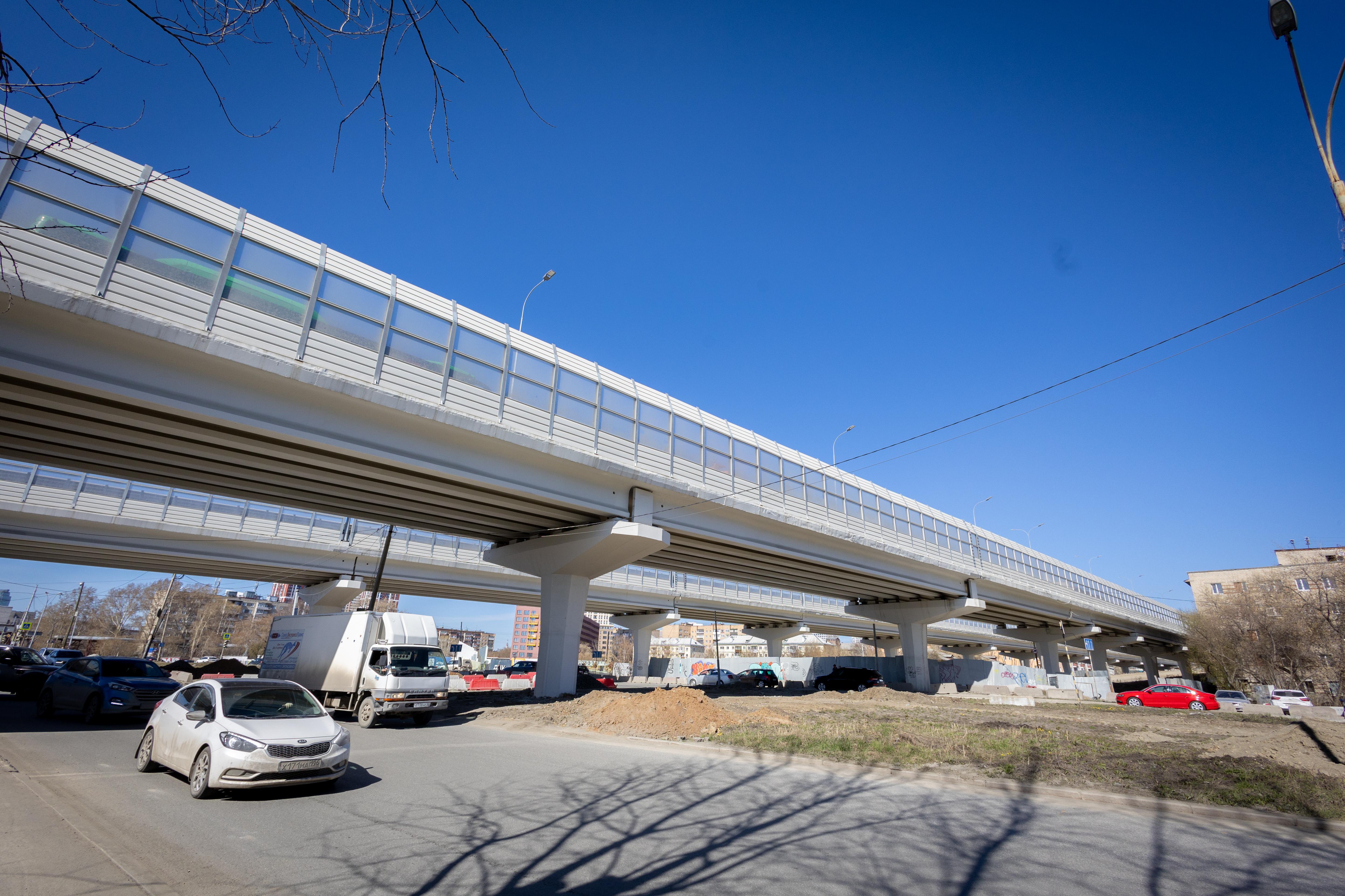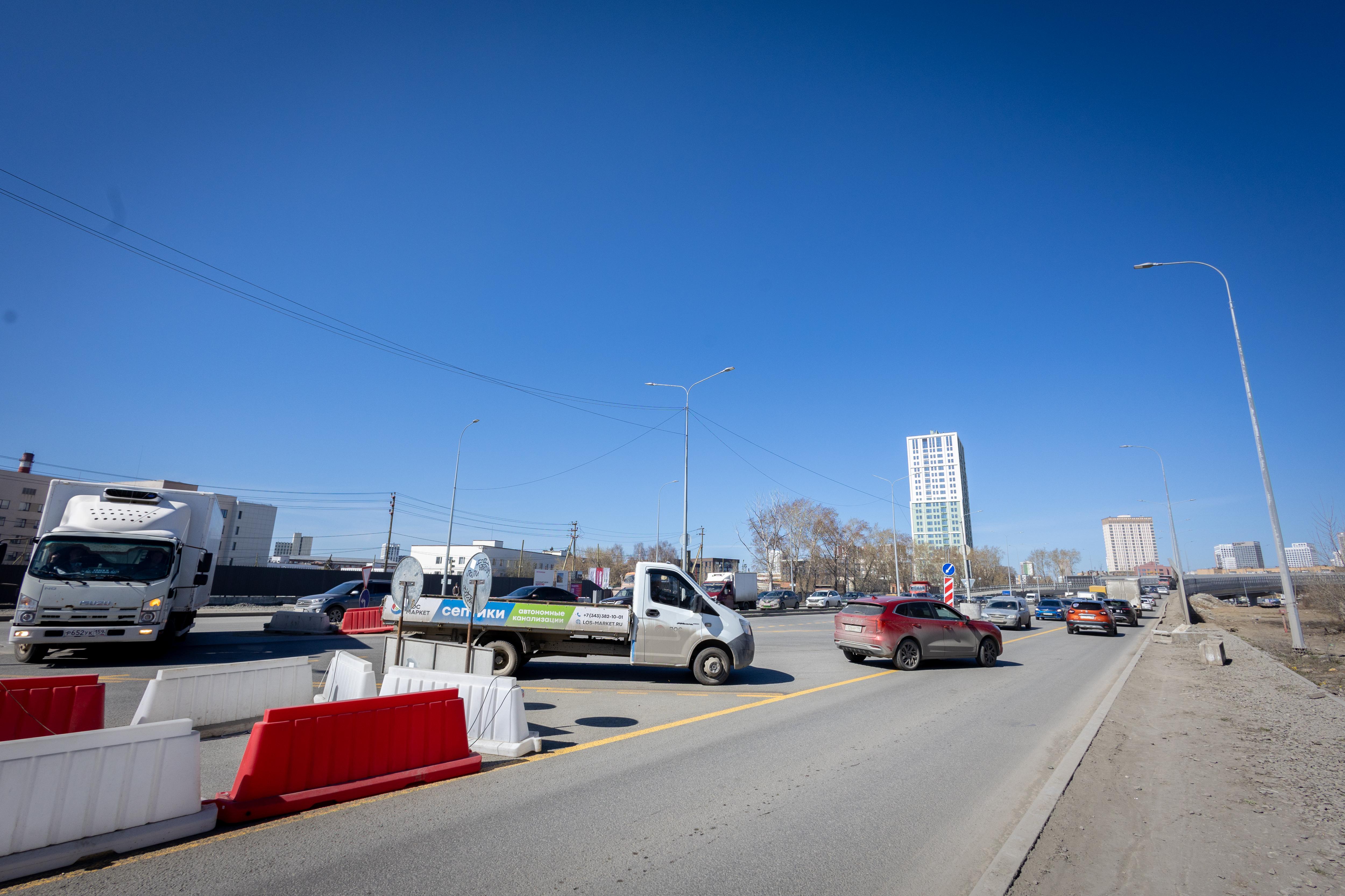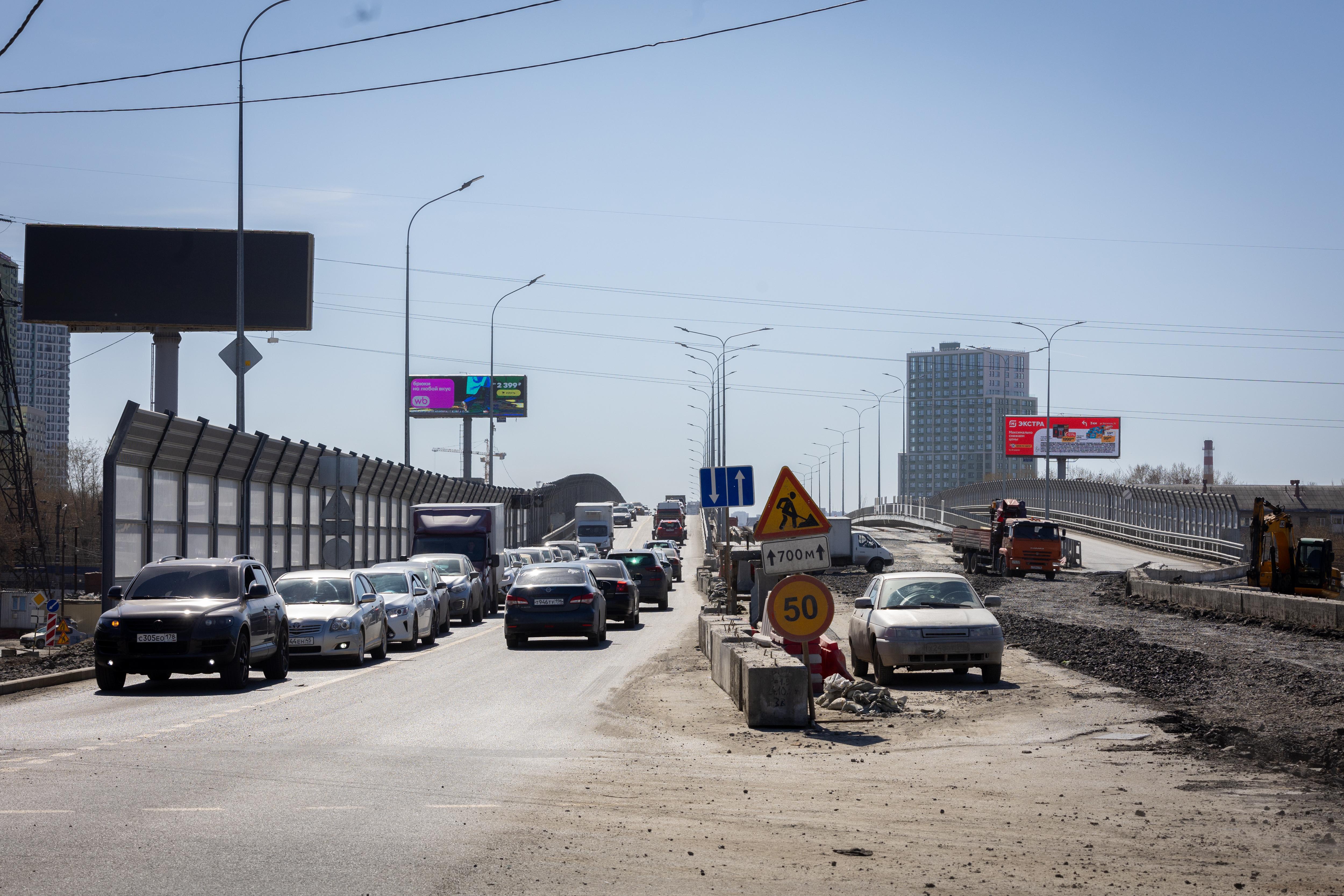 На время строительства развязки перекрыли левую эстакаду. Автомобили пустили по правой эстакаде, организовав там двустороннее движение.