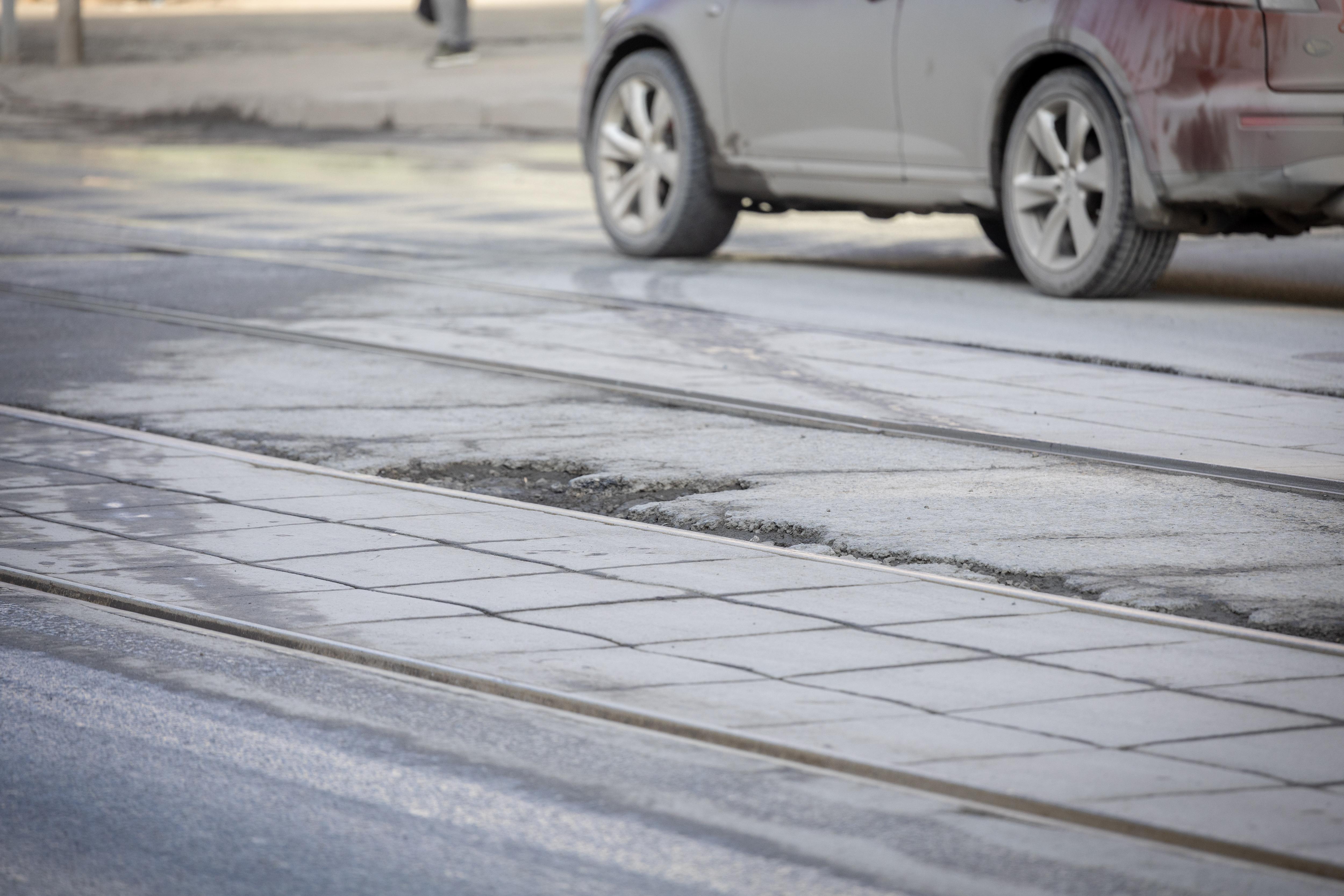 Разрушение асфальта в зоне трамвайных путей на улице Луначарского.