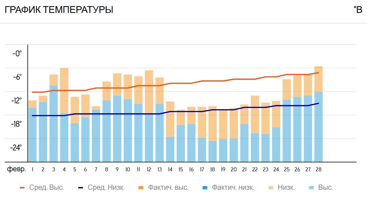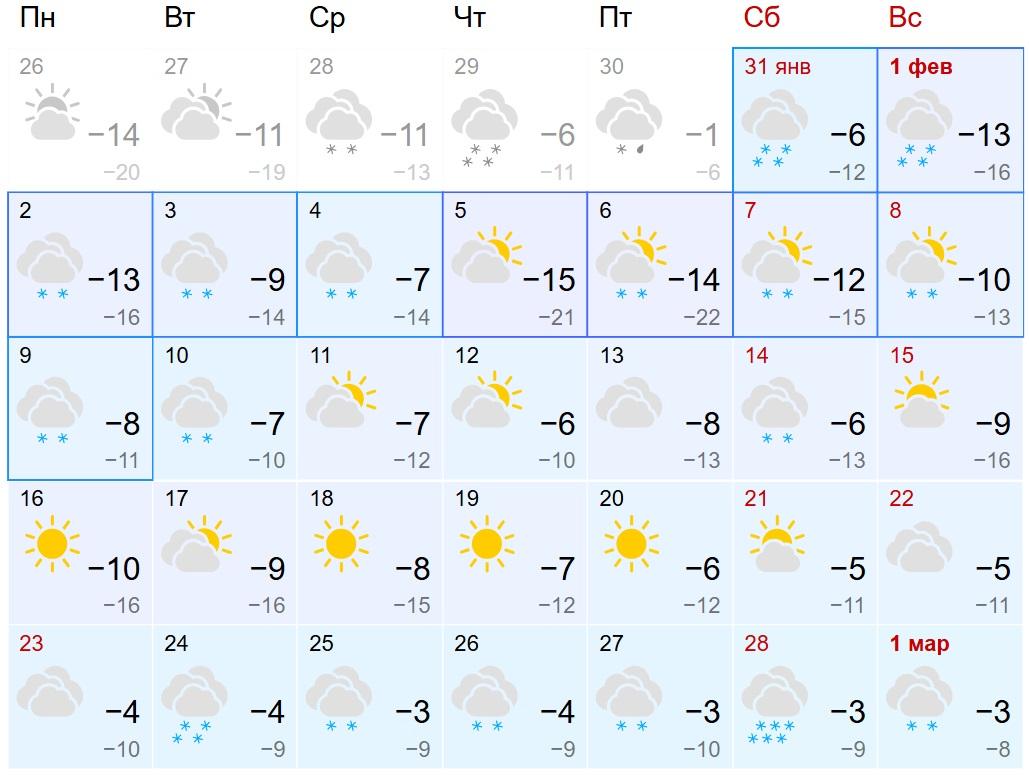 Сервис Accuweather прогнозирует морозную первую неделю с возможным похолоданием до -28 °C 6 и 7 февраля. В середине месяца ночи могут стать холоднее, до -20 °C, а завершится февраль снегопадами.